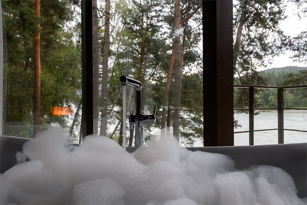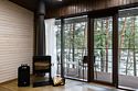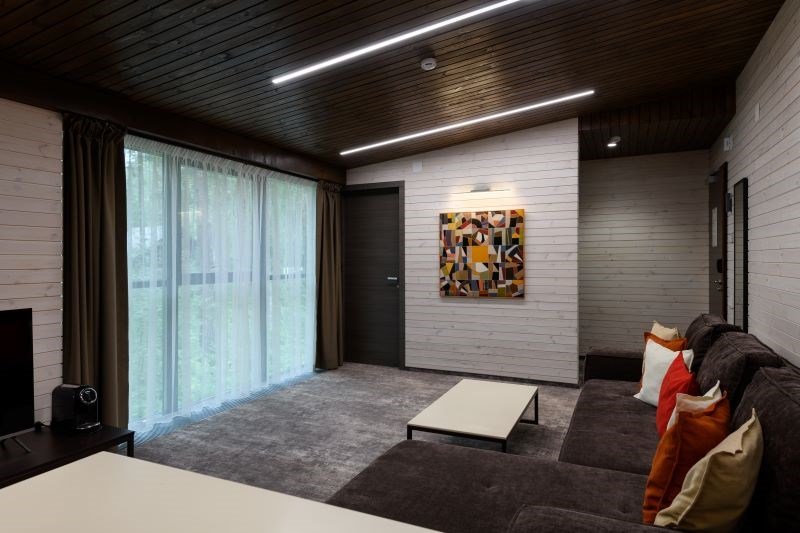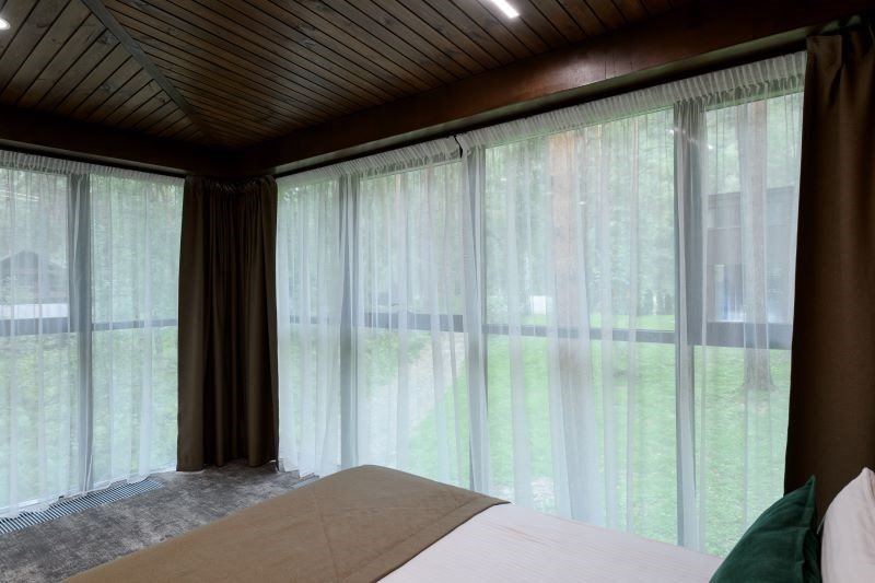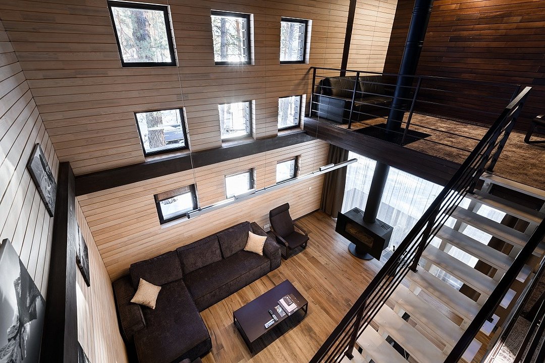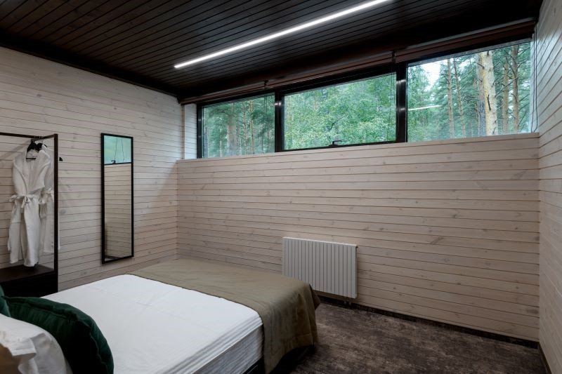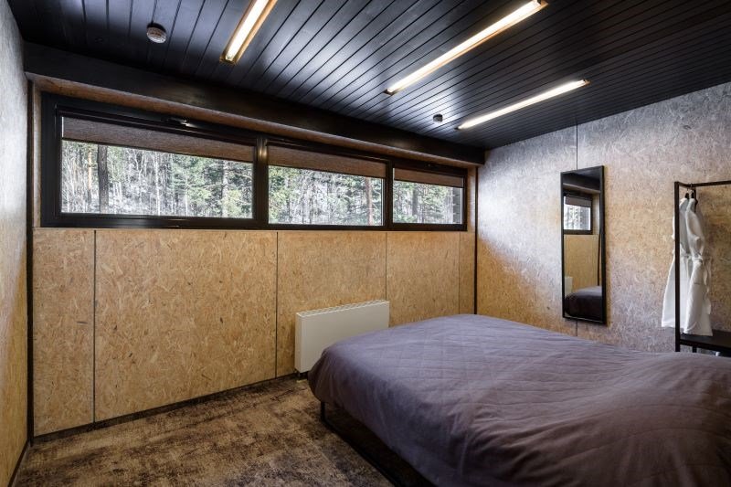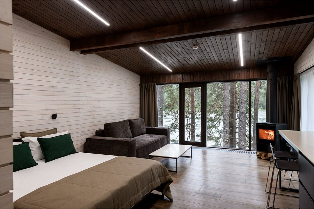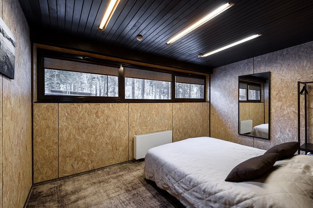 Номер расположен в основном корпусе эко-отеля на втором этаже. И гостиная и спальня имеет панорамное остекление.