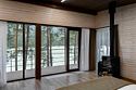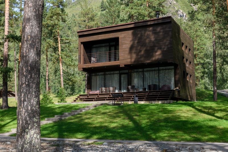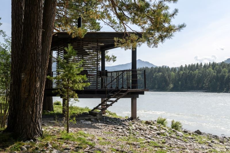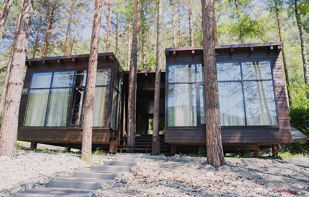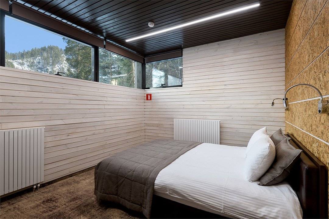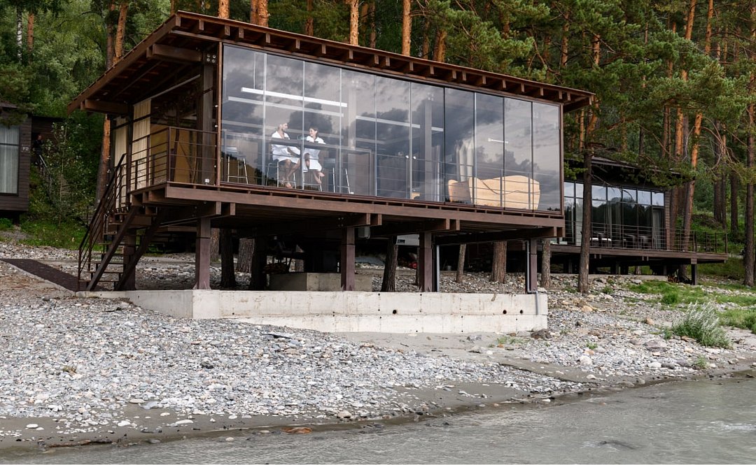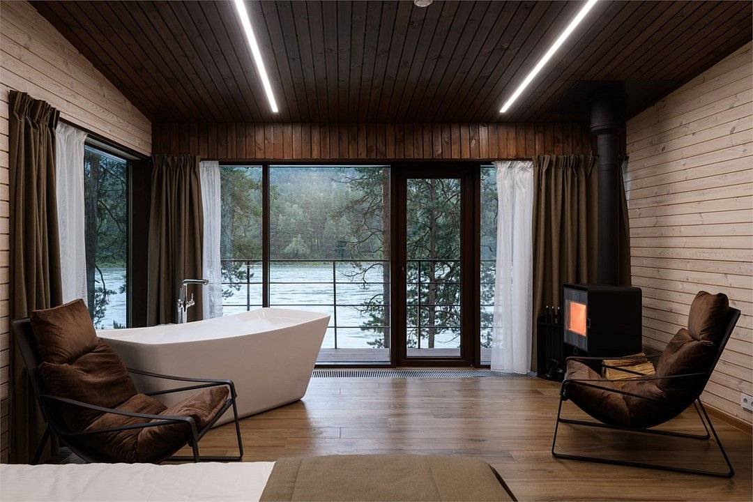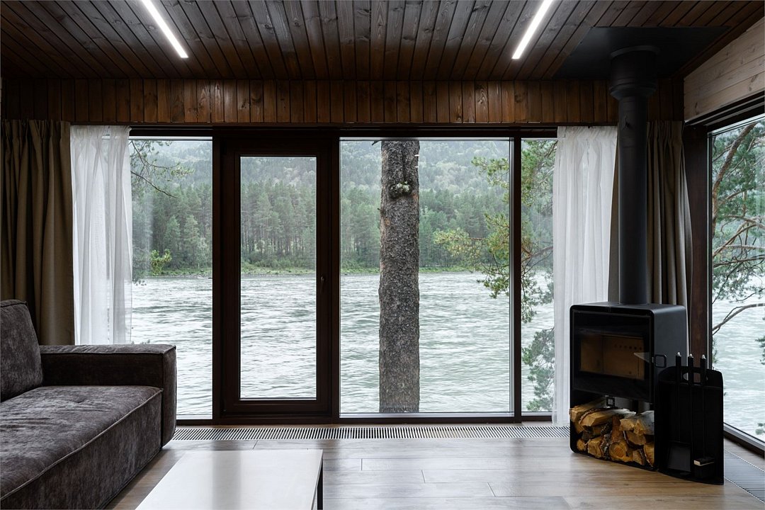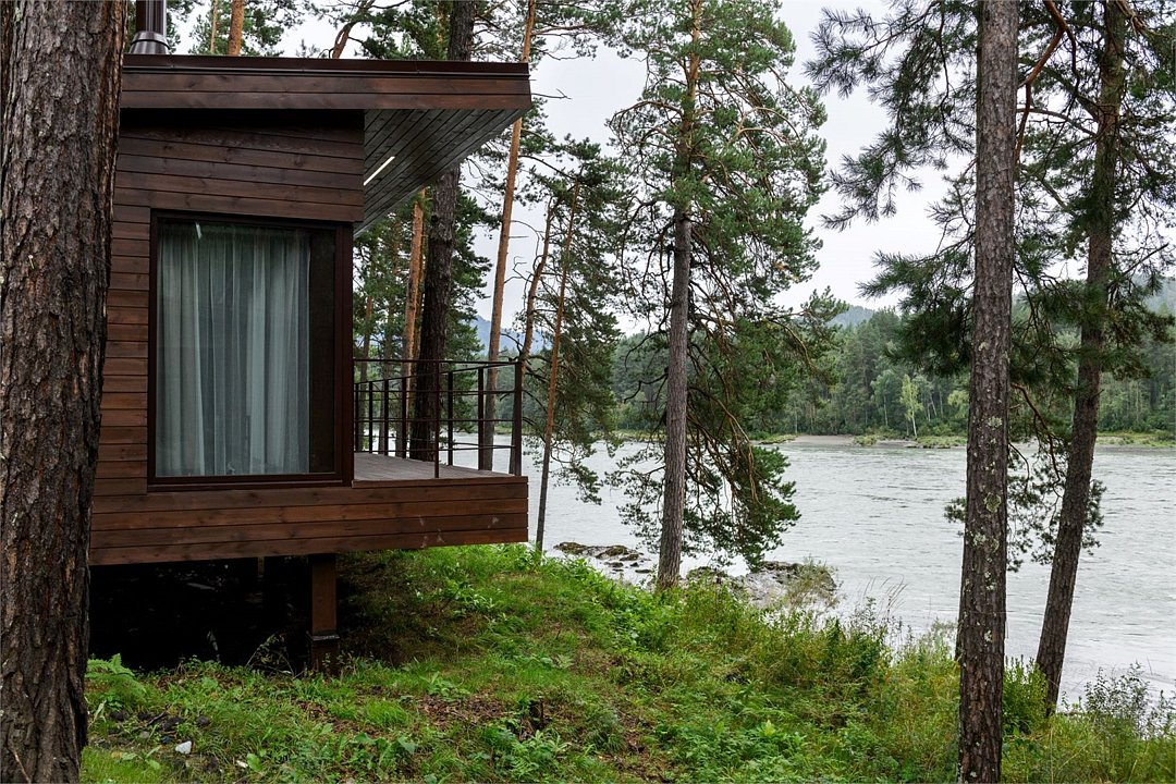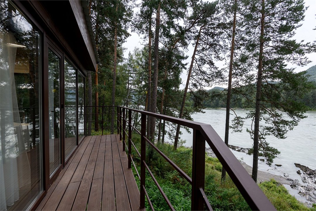 Номер расположен в одноэтажном отдельно стоящем коттедже. Одна из стен — панорамное окно с видом на Катунь.