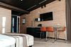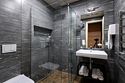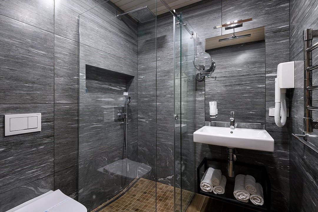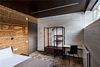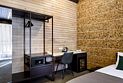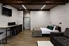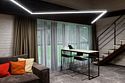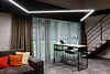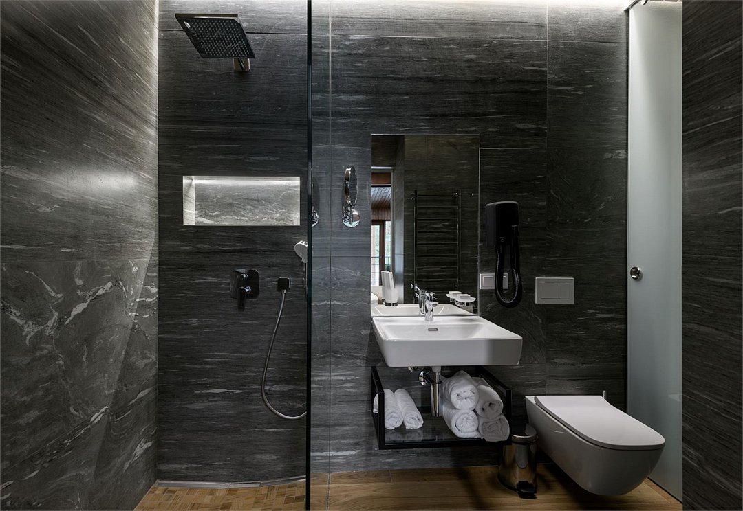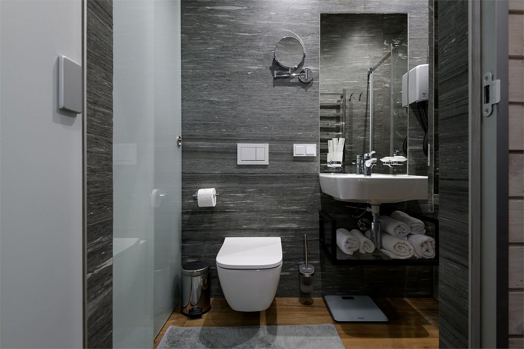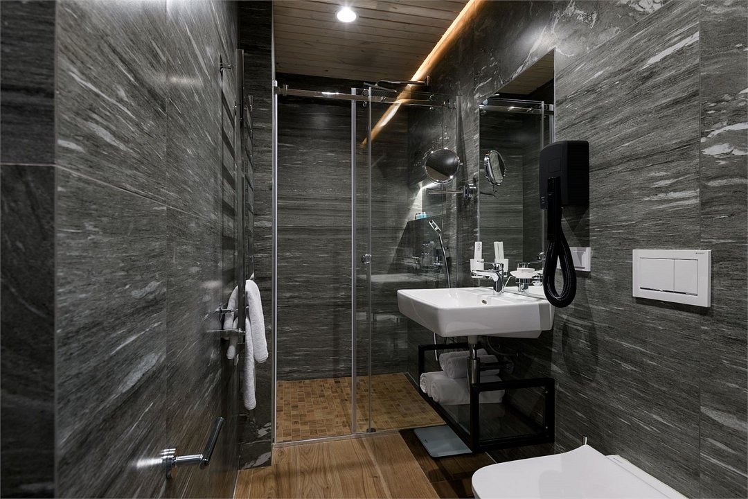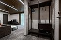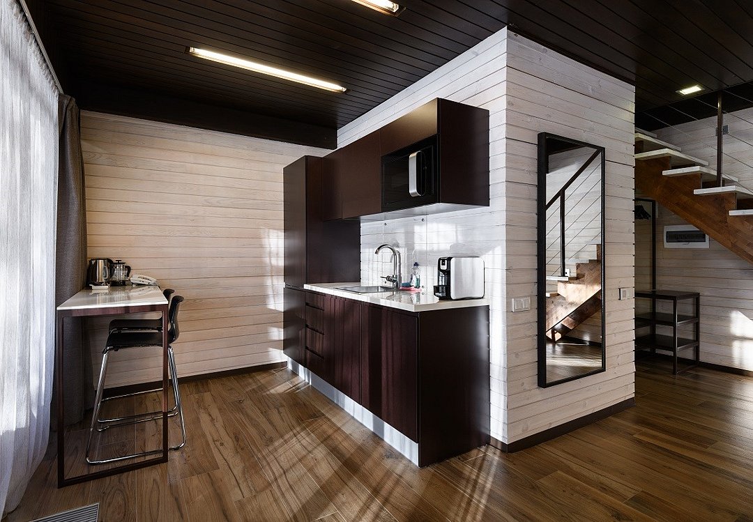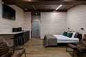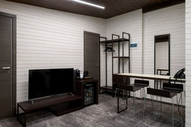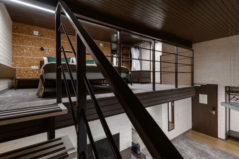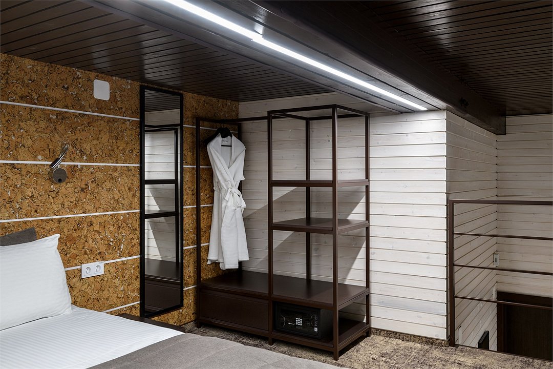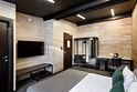 Номер расположен в основном корпусе эко-отеля на первом этаже и имеет два уровня. Одна из стен номера имеет панорамное остекление. Номер состоит из гостиной и спальни. Санузел с душевой кабиной.