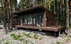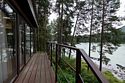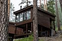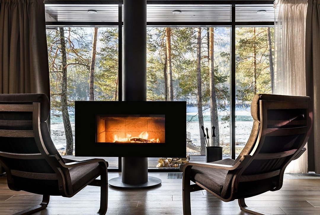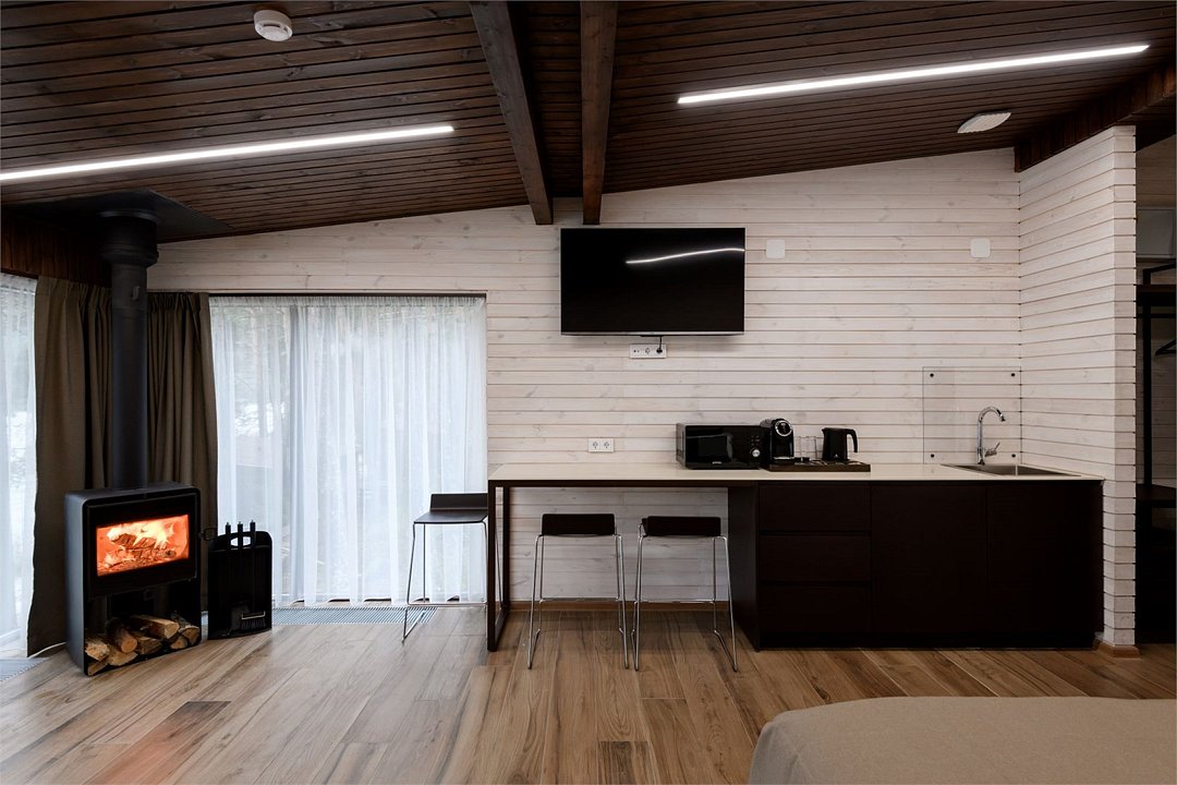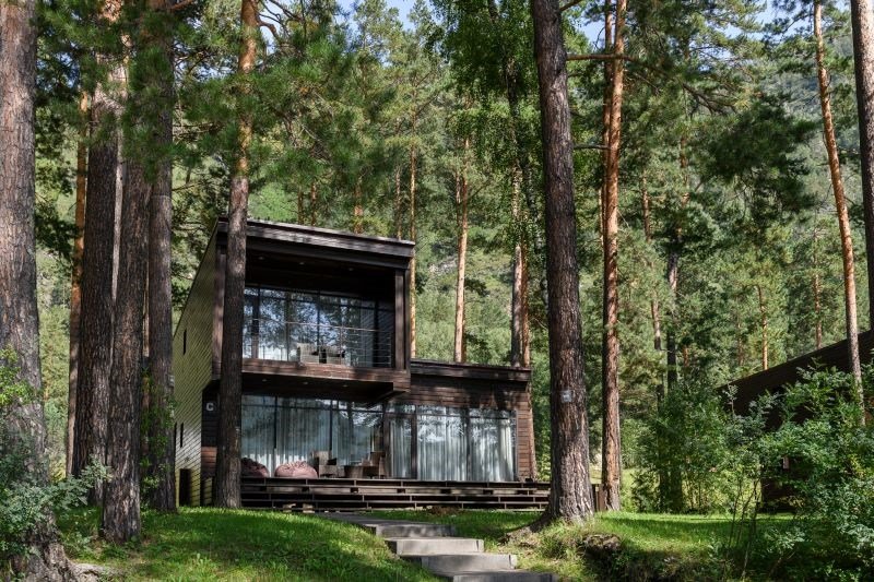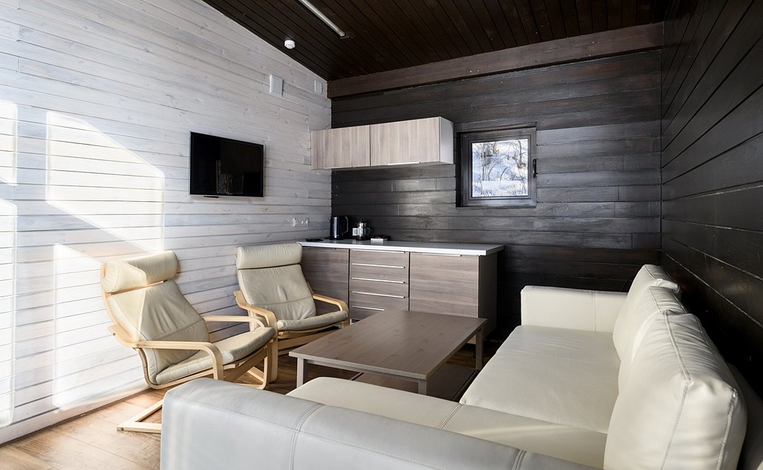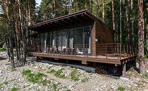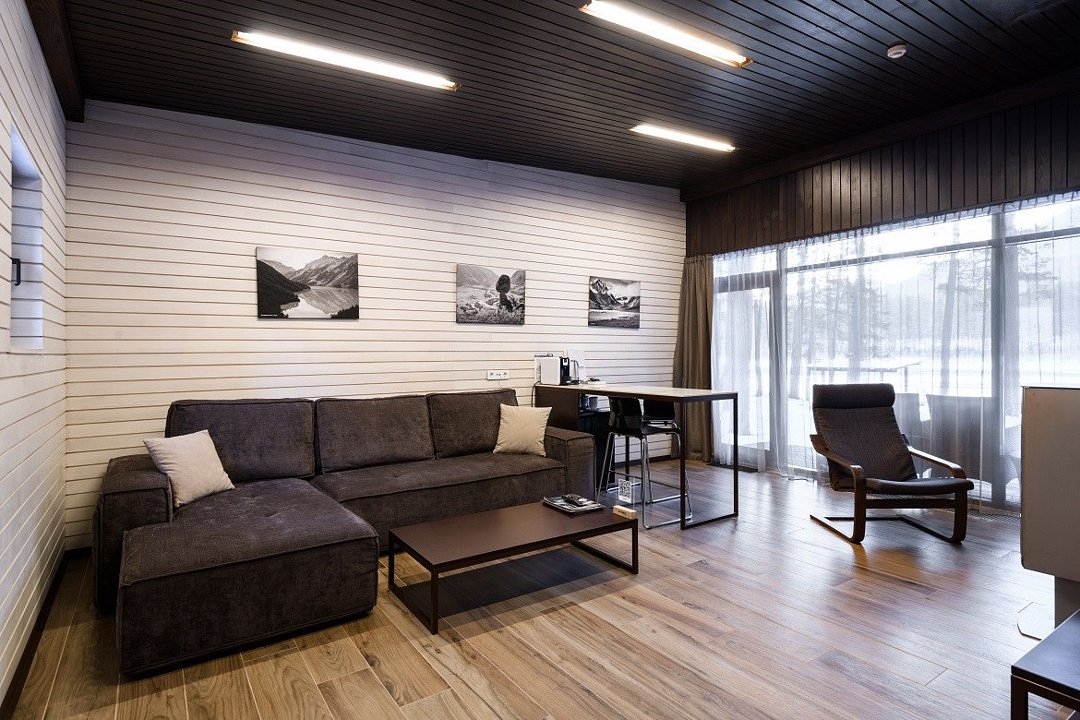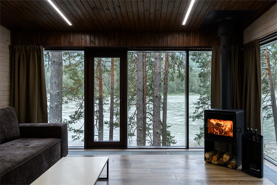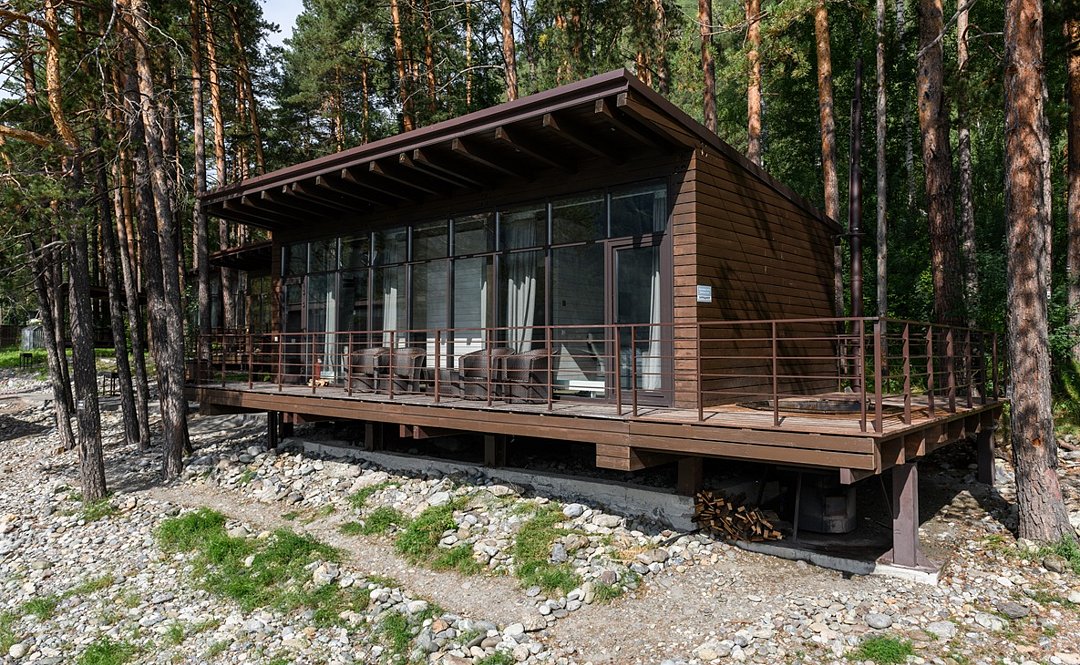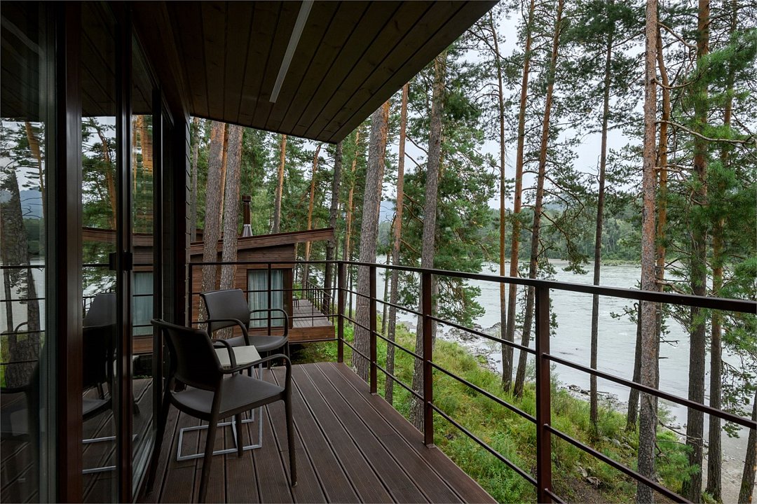Номер расположен в одноэтажном отдельно стоящем коттедже с собственной террасой и камином. Одна из стен — панорамное окно с видом на Катунь.