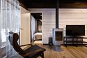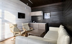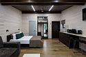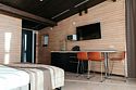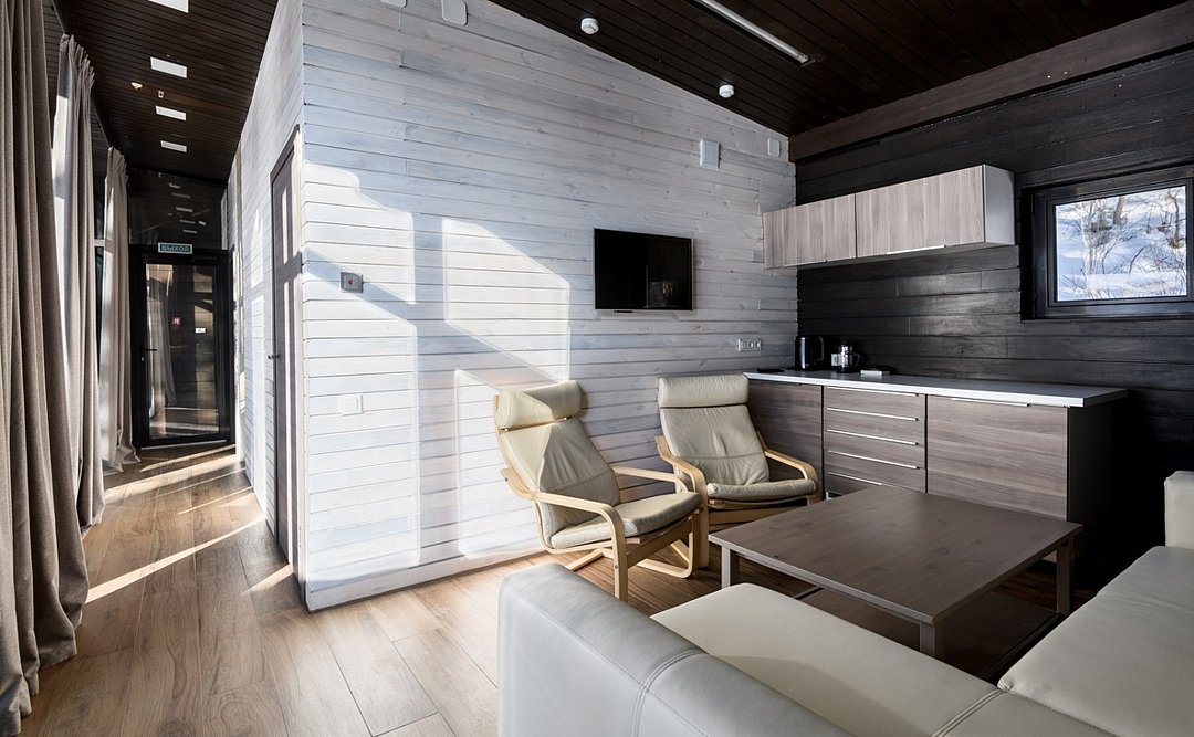 Номер расположен в одноэтажном отдельно стоящем коттедже с собственной террасой, ванной и камином. Одна из стен — панорамное окно с видом на Катунь.