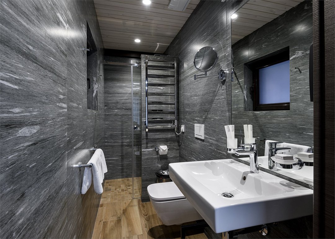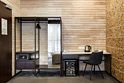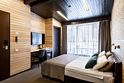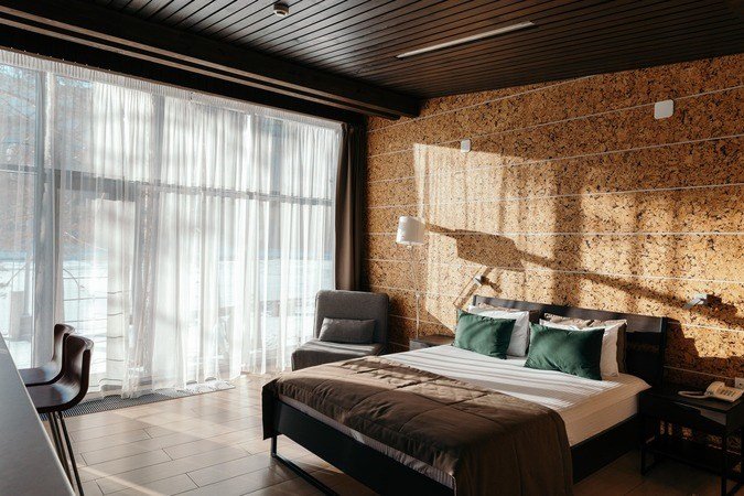 Уютный номер расположен в основном корпусе эко-отеля. Одна из стен любого номера категории Стандарт – панорамное окно.
