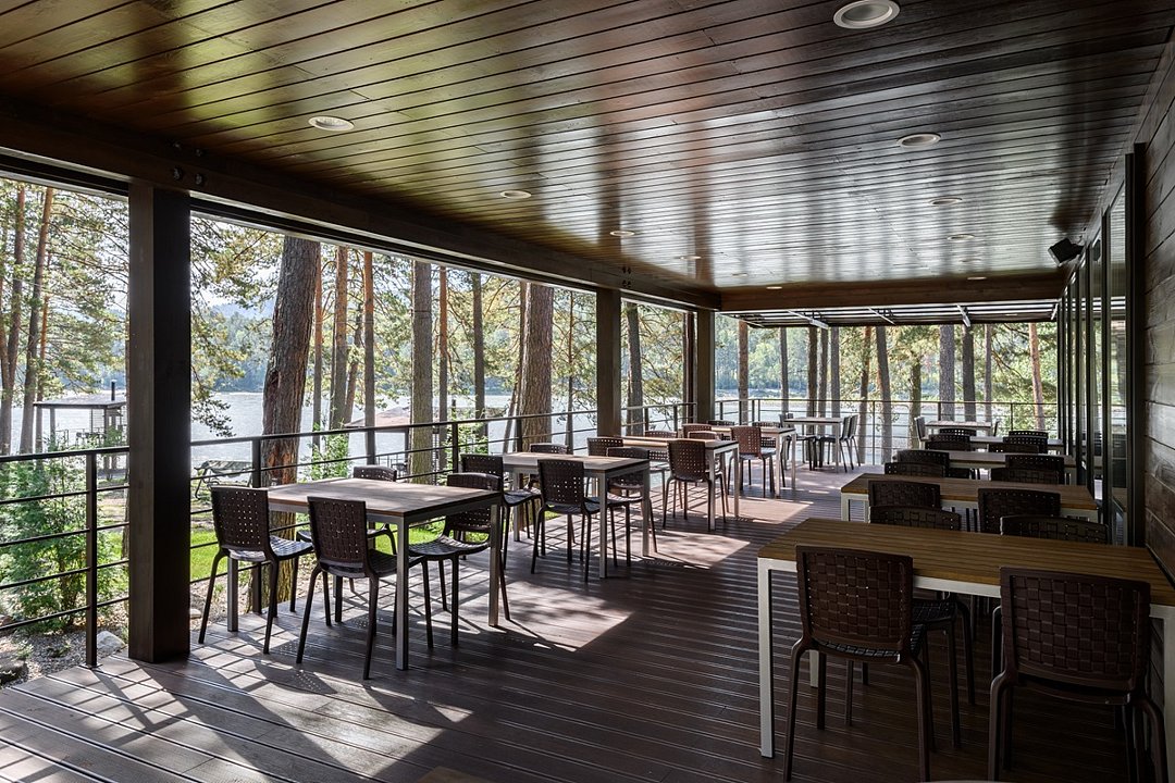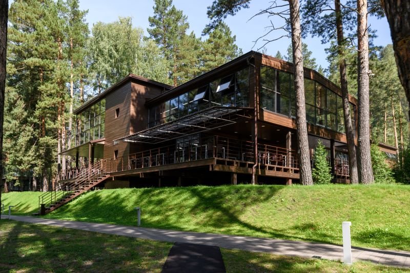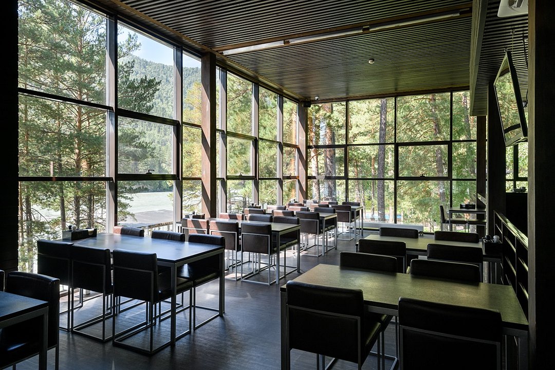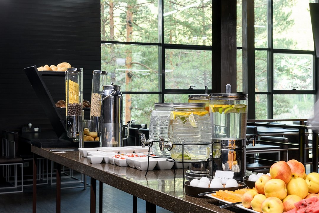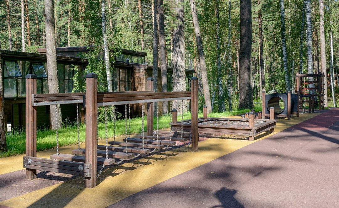 Территория отеля, окруженная лесом, уютна и функциональна. В ресторане с панорамными окнами и открытой террасой гости могут насладиться сытными завтраками, блюдами европейской кухни, местными деликатесами и сезонными новинками. Для детей предусмотрено отдельное меню. На берегу реки открыт гриль-бар. Также есть большая детская игровая площадка на улице и небольшая игровая зона у стойки регистрации. В детском игровом центре представлено множество элементов для игр, способствующих развитию пространственного мышления, логики и воображения у детей.