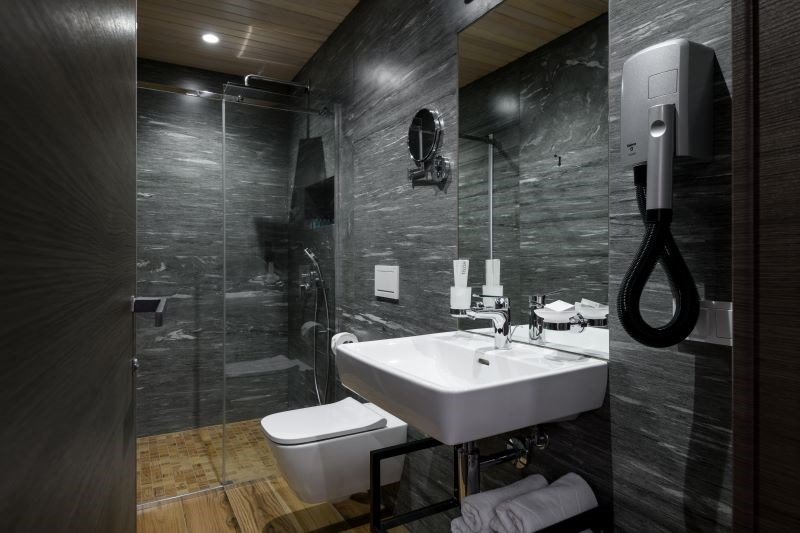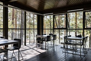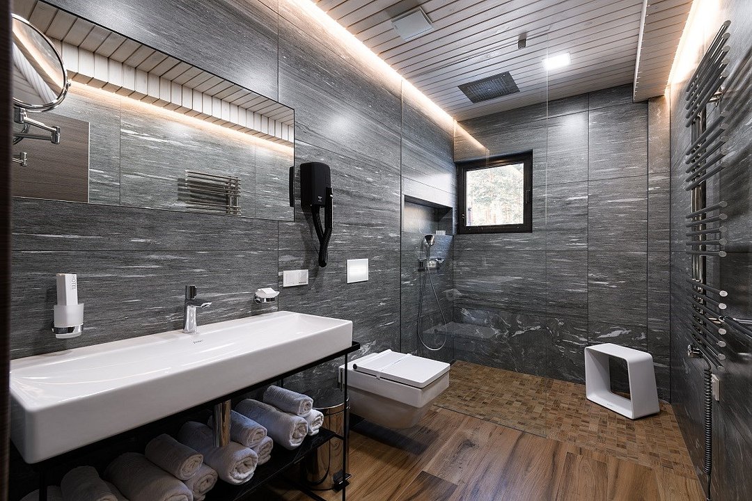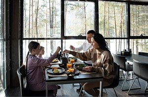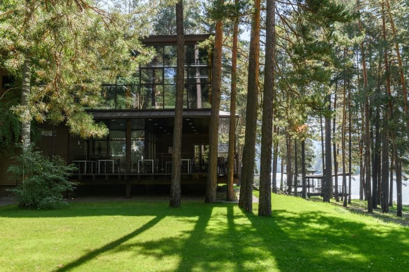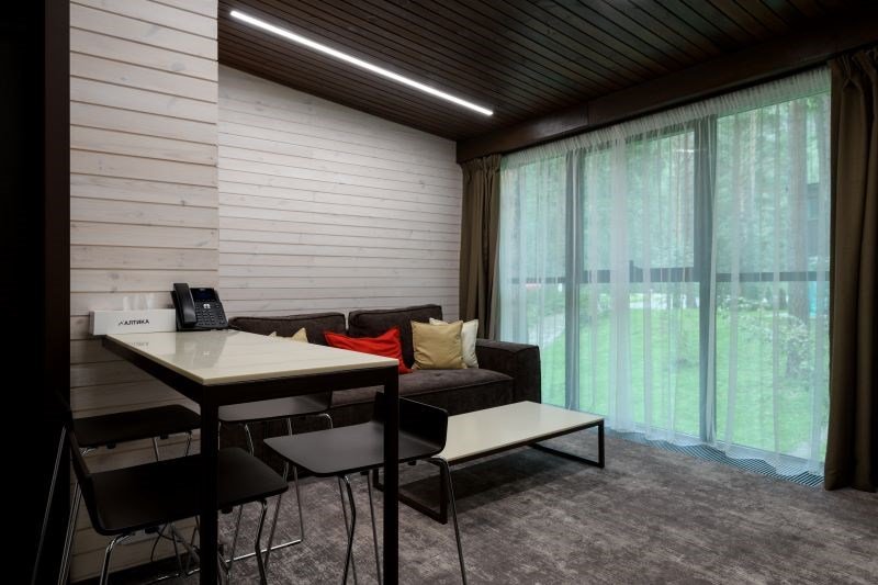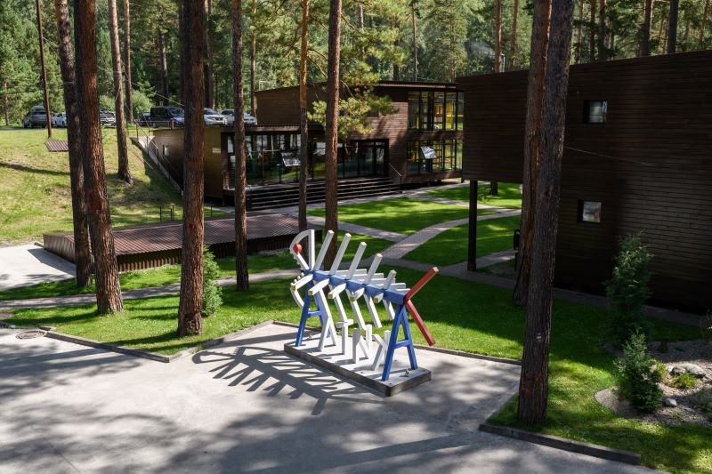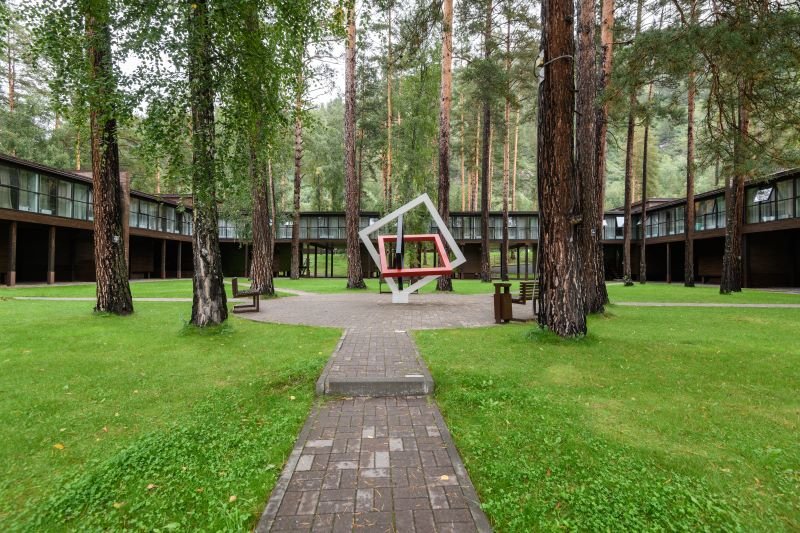 Территория отеля, окруженная лесом, уютна и функциональна. В ресторане с панорамными окнами и открытой террасой гости могут насладиться сытными завтраками, блюдами европейской кухни, местными деликатесами и сезонными новинками. Для детей предусмотрено отдельное меню. На берегу реки открыт гриль-бар. Также есть большая детская игровая площадка на улице и небольшая игровая зона у стойки регистрации. В детском игровом центре представлено множество элементов для игр, способствующих развитию пространственного мышления, логики и воображения у детей.