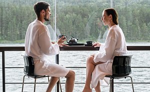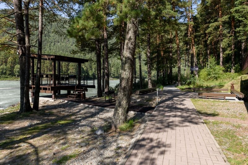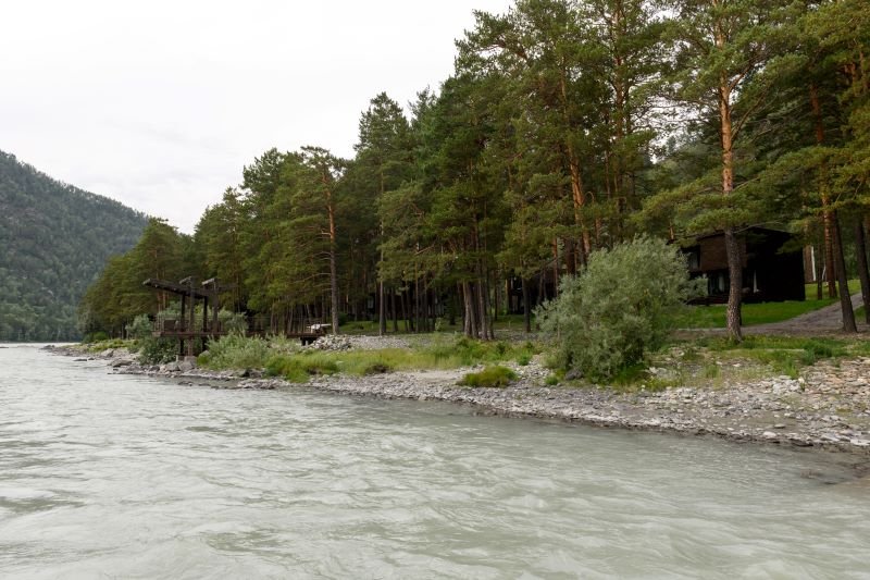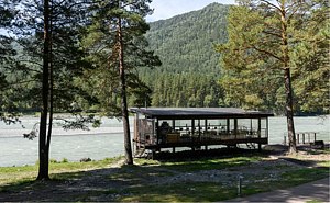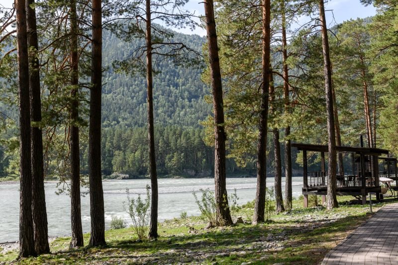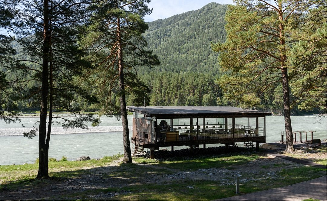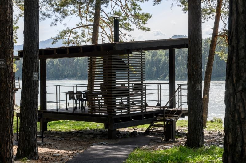 Эко-отель предлагает доставку блюд из ресторана прямо в номер, в баню или на берег Катуни. Почему бы не насладиться пикником на террасе коттеджа среди сосен с живописным видом на реку?
