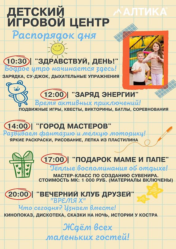 Детский центр эко-отеля «Алтика» приглашает малышей в увлекательный мир игр. Здесь есть все для веселого и полезного времяпровождения: лабиринт, разнообразные горки, включая те, что для катания на ватрушках, полоса препятствий, сухой бассейн с мягким наполнителем, туннели, батут, воздушная пушка, конструкторы и интерактивная игровая система.