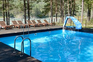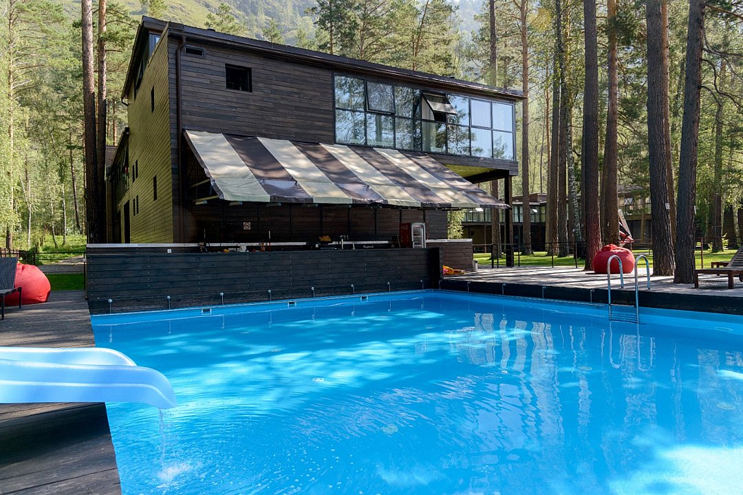 Эко-отель «Алтика» предлагает своим гостям открытый сезонный бассейн с подогревом и панорамным видом на реку Катунь. Вокруг бассейна установлены удобные шезлонги, а сам бассейн разделен на две секции — для взрослых и детей, что позволяет наслаждаться отдыхом всем членам семьи.
