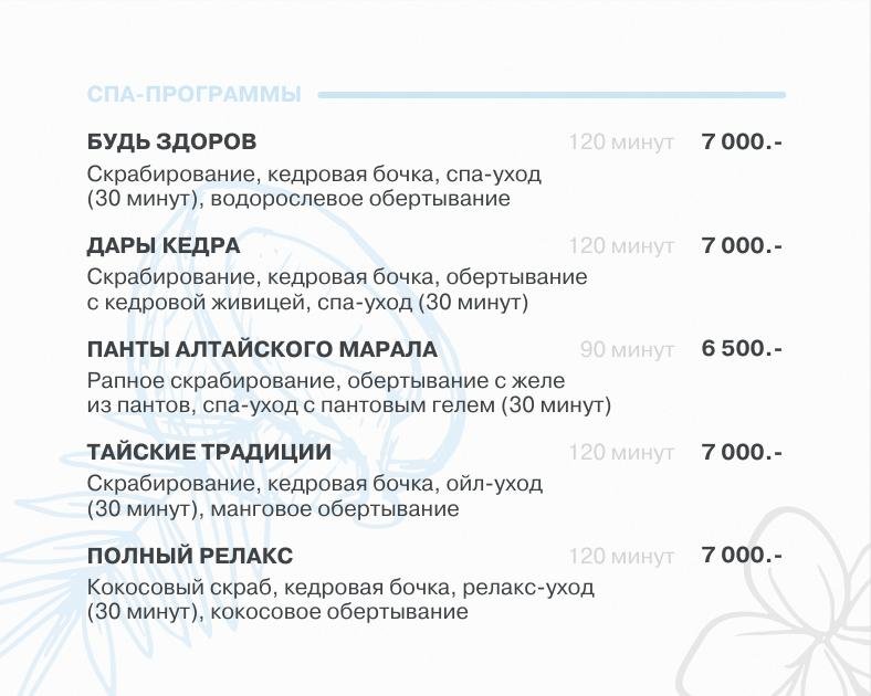 SPA-центр предлагает широкий спектр процедур: скрабирование, обертывания, сеансы в кедровой бочке и разнообразные виды массажа. Услуги доступны в трех форматах: для девичника, для двоих или в индивидуальном порядке.