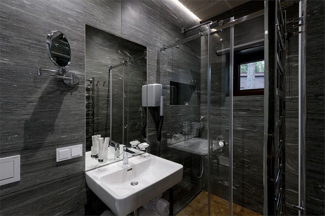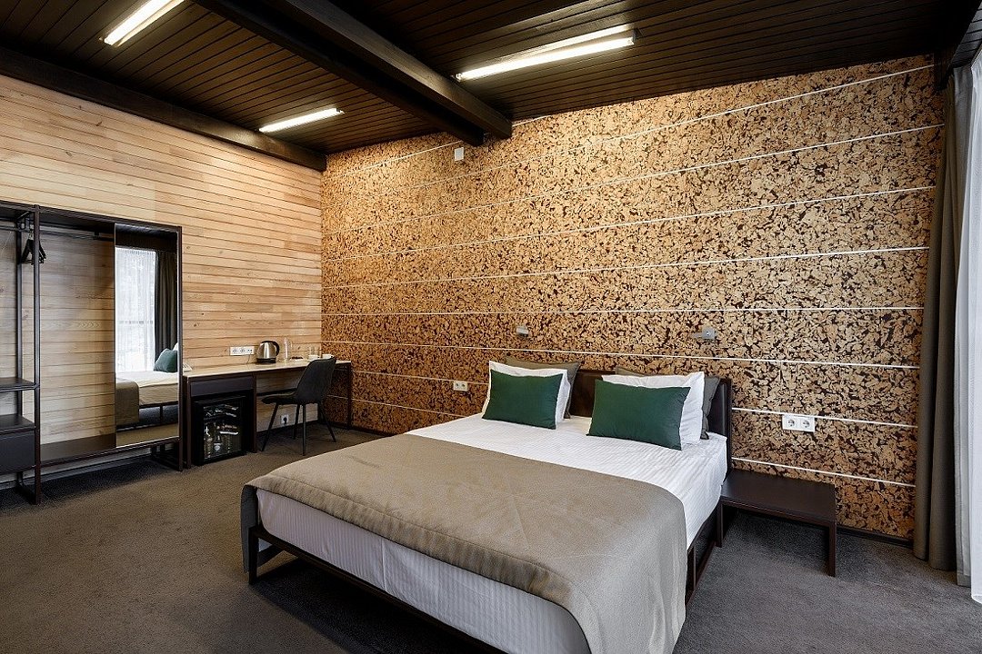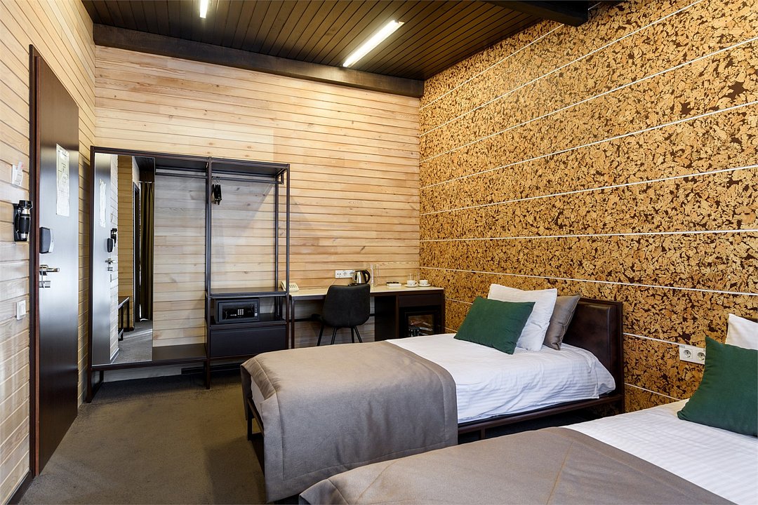 Уютный номер расположен в основном корпусе эко-отеля. Одна из стен любого номера категории «Стандарт» — панорамное окно. Вместимость: два основных места.