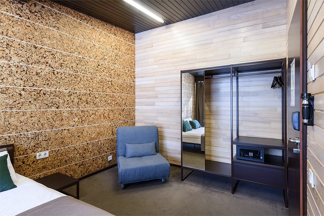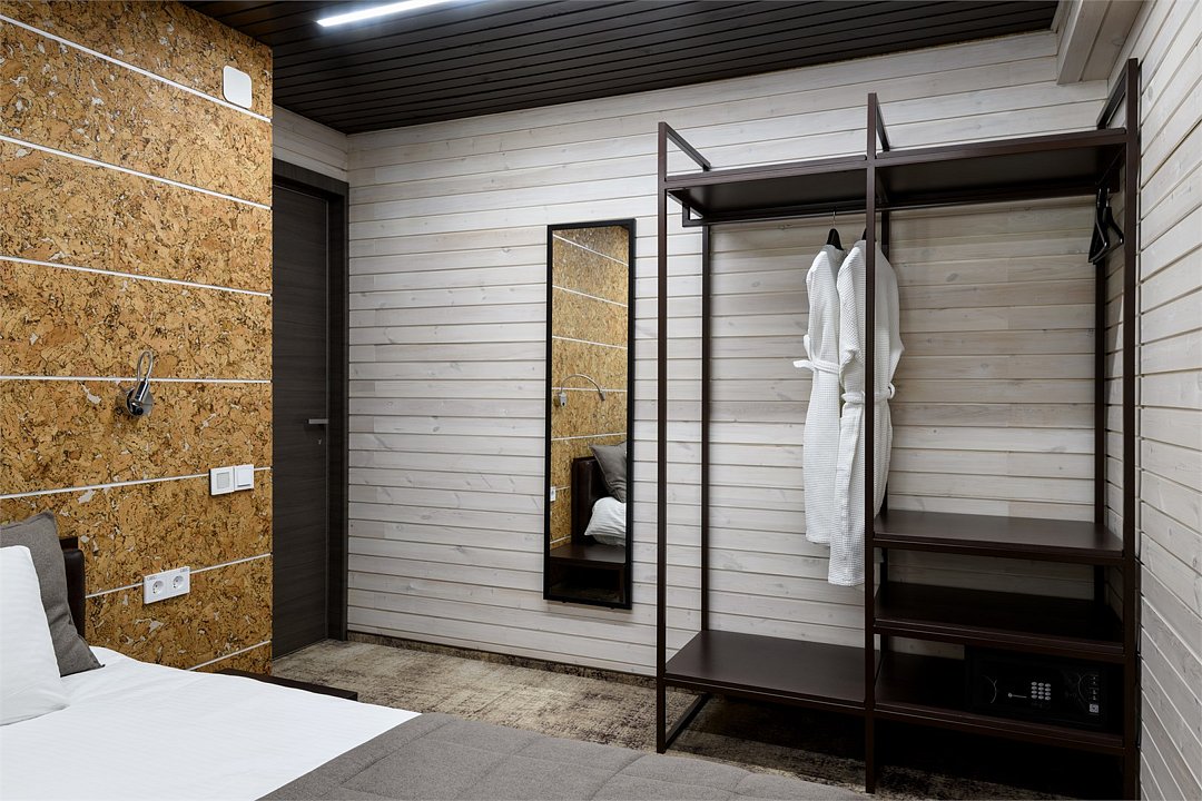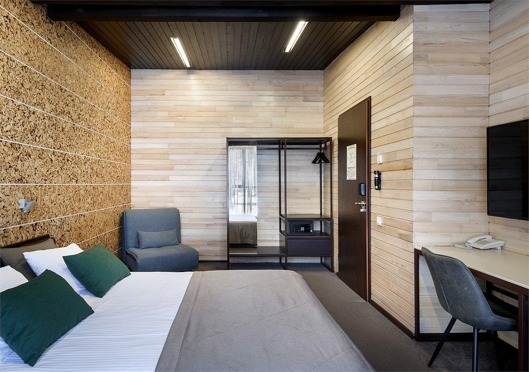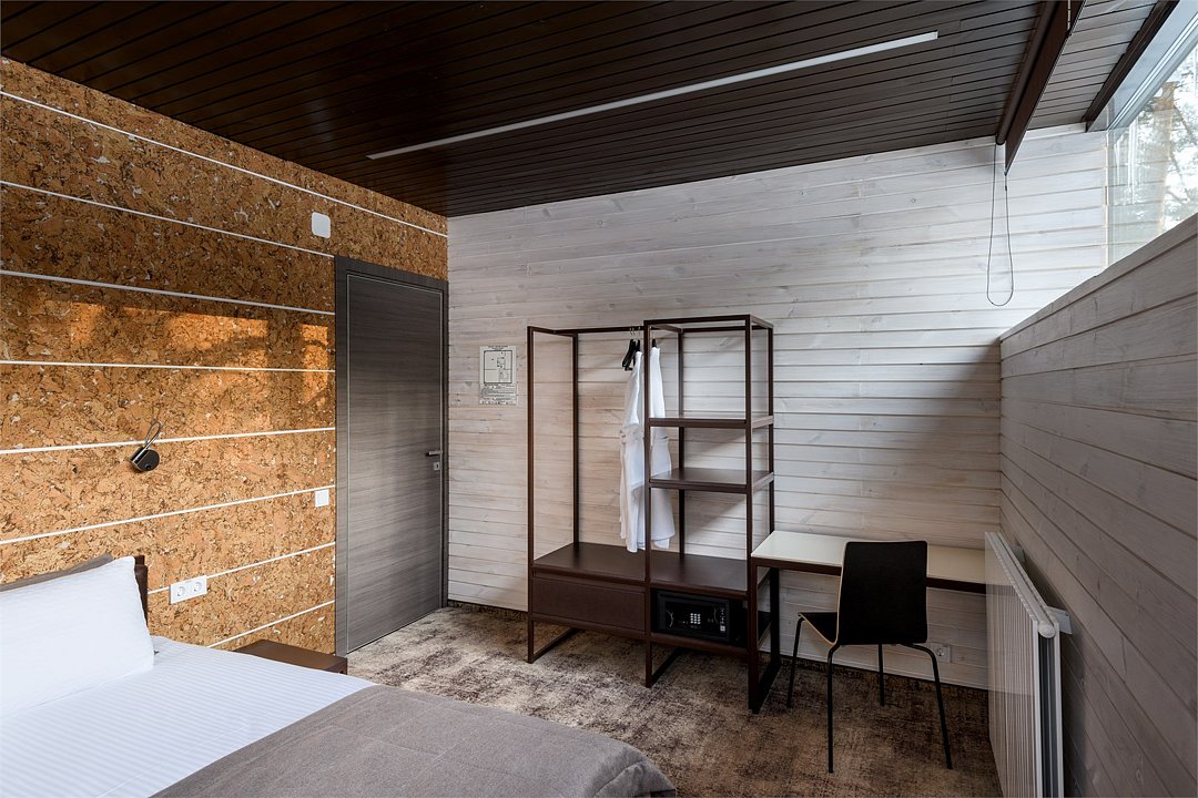 Уютный номер расположен в основном корпусе ЭКО-отеля. Одна из стен любого номера категории «Стандарт» — панорамное окно.