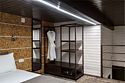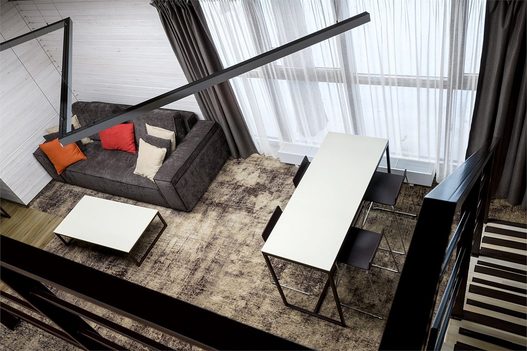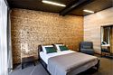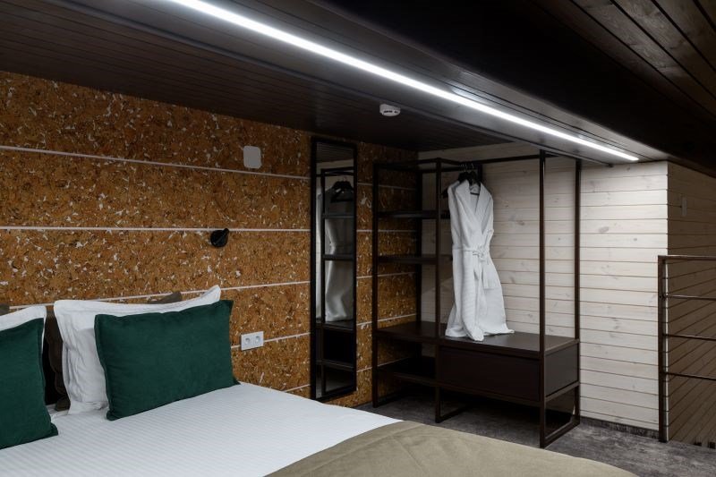 Номер расположен в основном корпусе эко-отеля на втором этаже. Одна из стен номера имеет панорамное остекление. Номер состоит из гостиной и спальни.