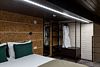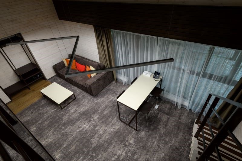 Номер расположен в основном корпусе эко-отеля на третьем этаже. Одна из стен номера имеет панорамное остекление. Номер состоит из гостиной и спальни.
