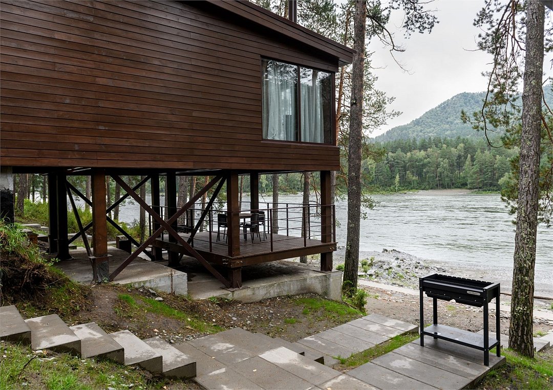 Двухэтажный коттедж расположен на берегу реки Катунь и имеет собственную террасу для барбекю. На первом этаже гостиная и полноценная кухня. На втором — две спальни, санузел. Есть балкон.