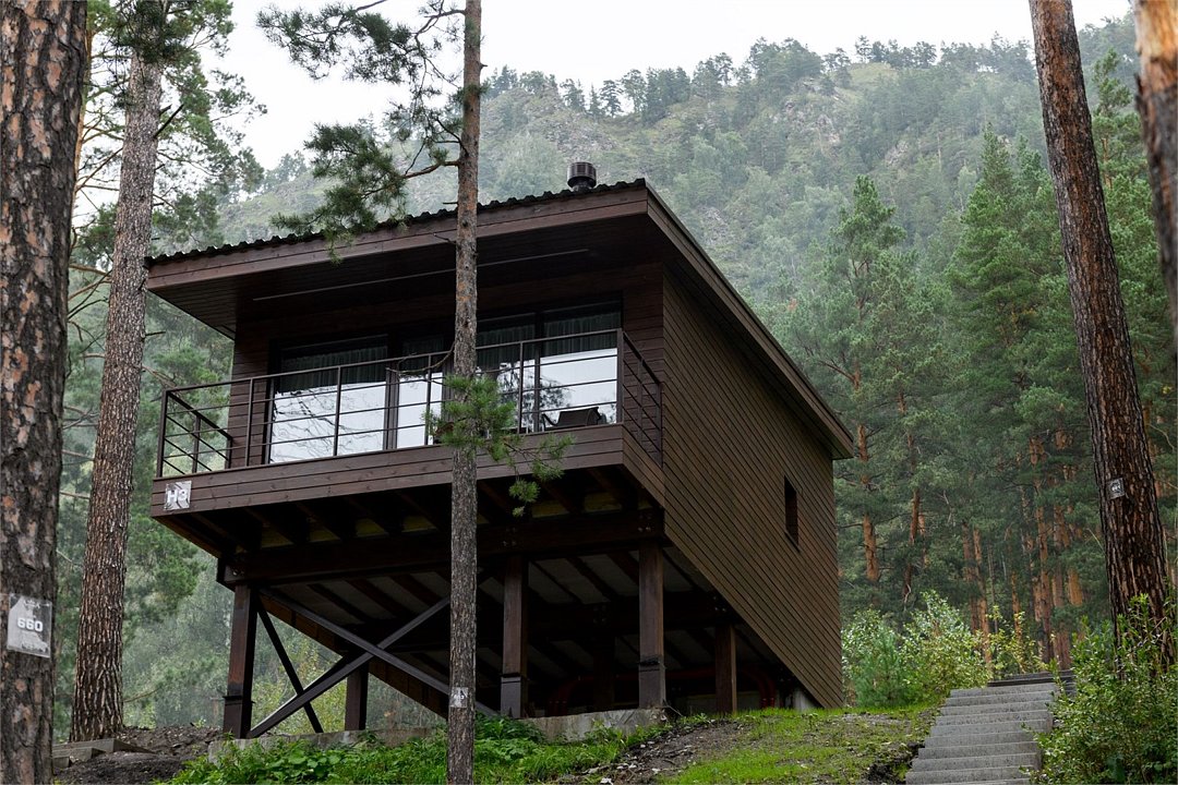 Номер расположен в одноэтажном отдельно стоящем коттедже с балконом и камином. Одна из стен — панорамное окно с видом на Катунь.
