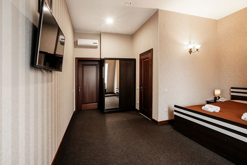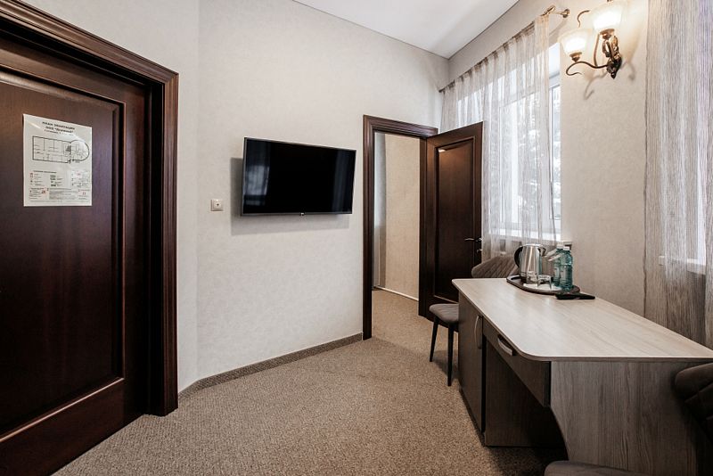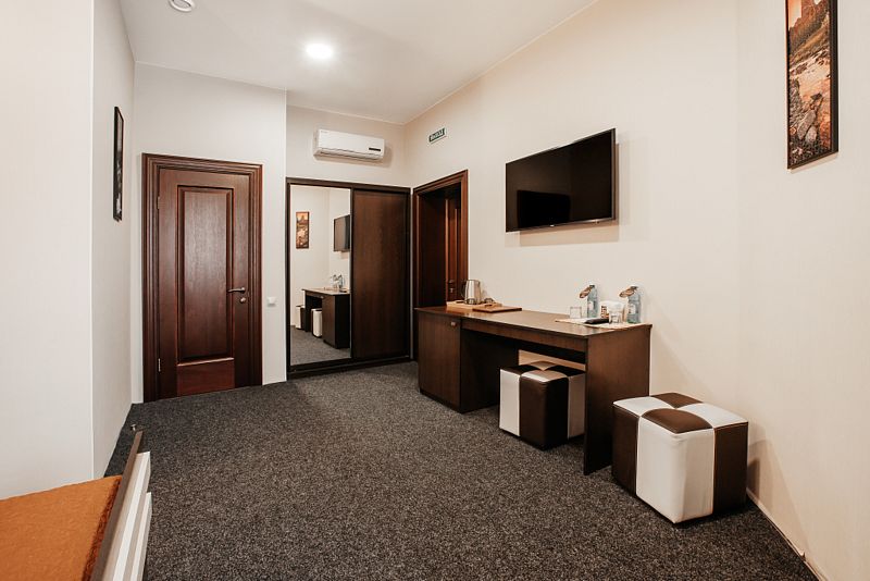 Очень большой по площади номер. С новым ремонтом. Двухкомнатный: просторная гостиная комната и огромная спальня. Позволяет комфортно разместиться как двоим, так и четверым гостям. Номер оборудован всем необходимым. В спальне - одна большая кровать, размера кинг-сайз (180*200). Прикроватные тумбочки, светильники, кресло. Вид из окна на город и на горы.