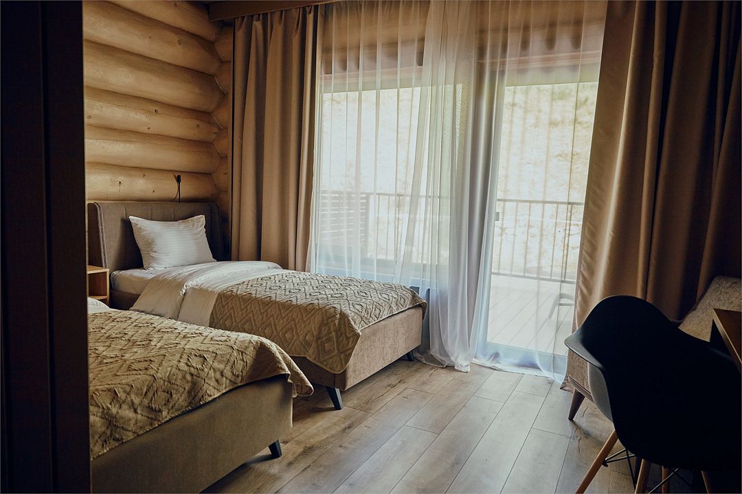 Wi-Fi, фен, теплый пол, халаты, банные полотенца, тапочки, балкон с красивым видом, две полутораспальные кровати, шкаф для одежды, зеркало, чайник, душ, кресло, стул, стол, туалетные средства, мини-холодильник, без питомцевВ гостиничном номере