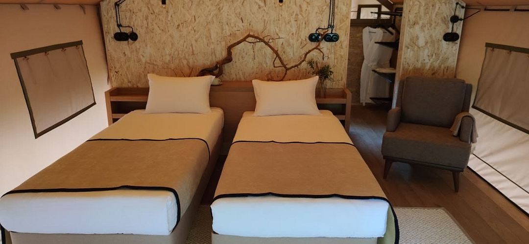 - В номерах деревянного дома размещение с животными запрещено. С мая по октябрь открыт глэмпинг у реки и взять своего любимца с собой вы сможете при размещении в благоустроенных сафари-тентах.
