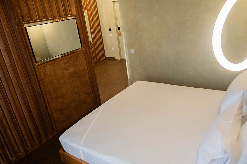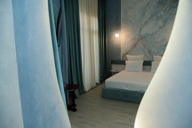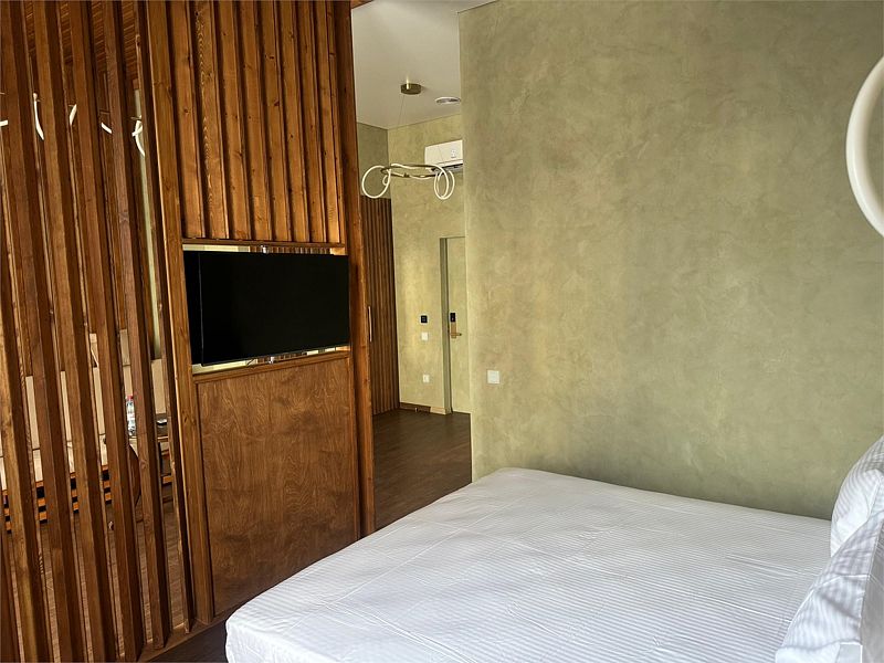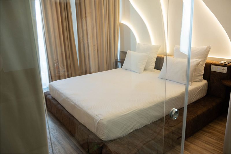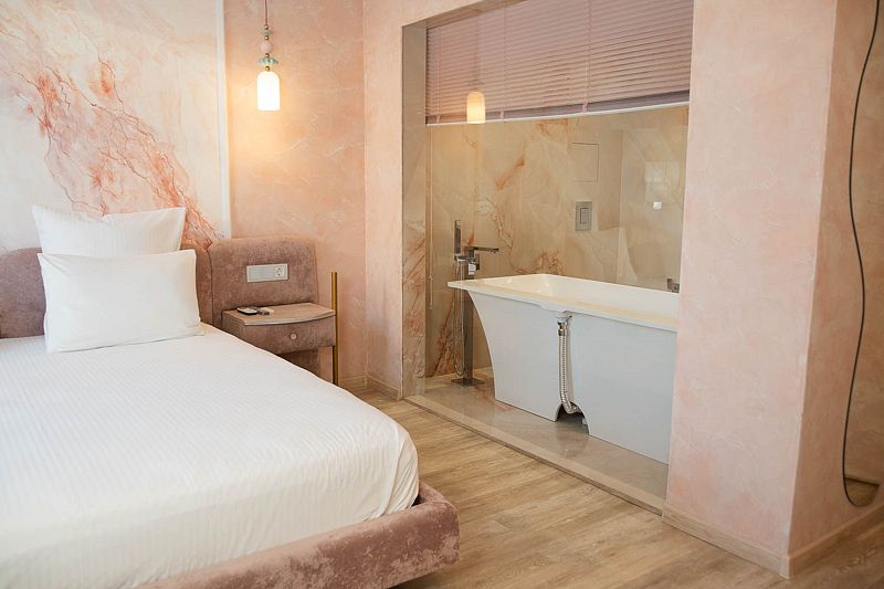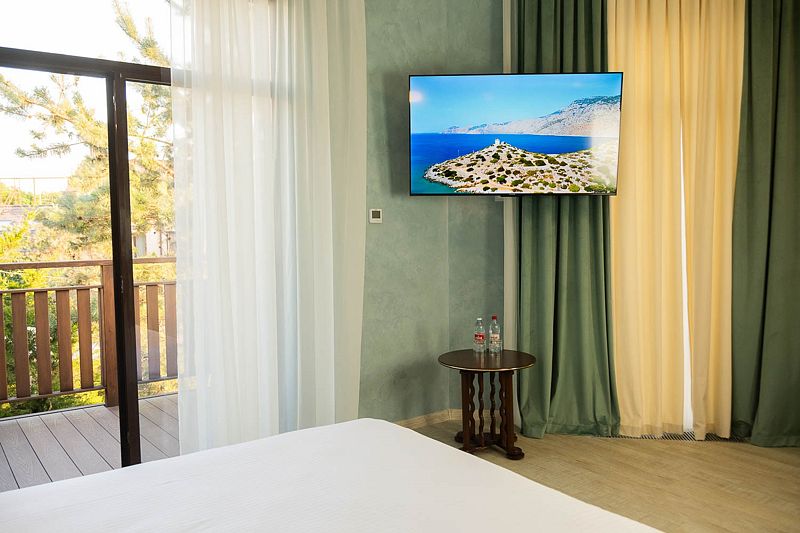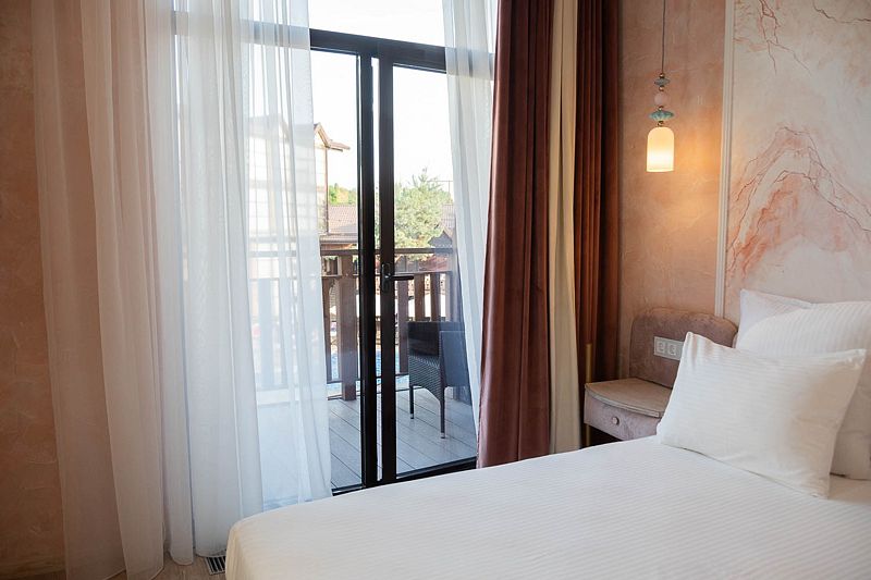 Авторский дизайн номера выполнен в изысканном современном стиле с применением экологичных материалов и рассчитан на комфортное проживание двух гостей. Здесь находится всё необходимое для прекрасного отдыха. Помимо широкой двуспальной кровати с ортопедическим матрасом и другой современной мебели, к услугам гостей SMART-TV, внутренний телефон и бесплатный Wi-Fi. Изюминка номера — «прозрачный санузел», который оснащен изысканной ванной, феном и высококачественным текстилем.