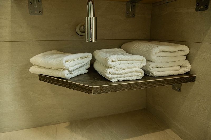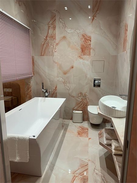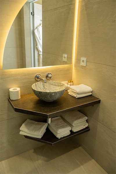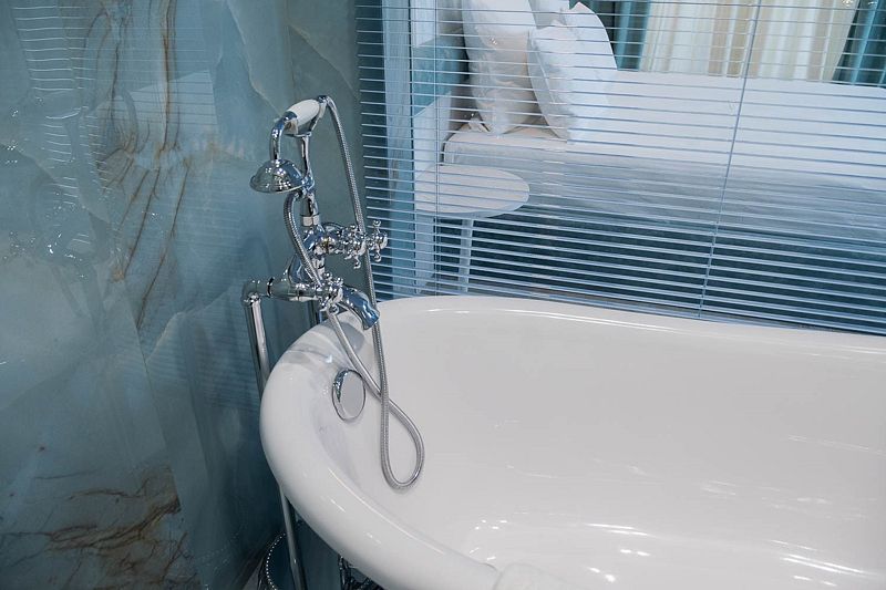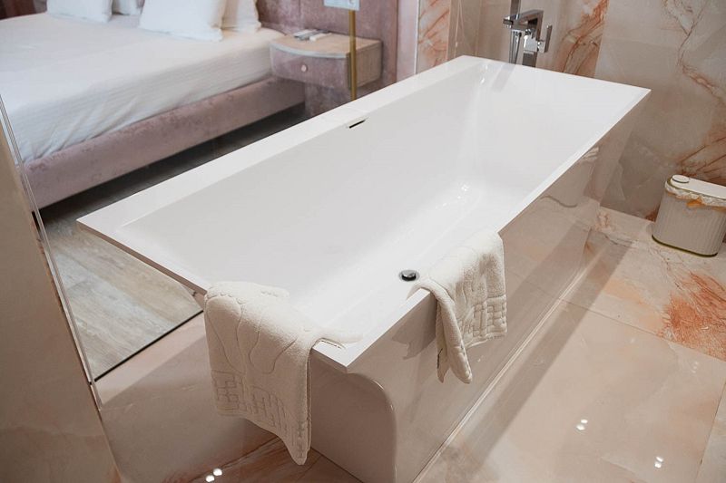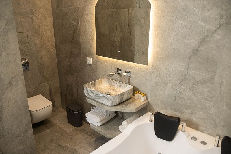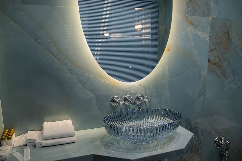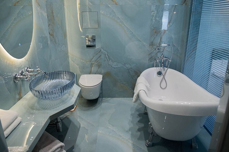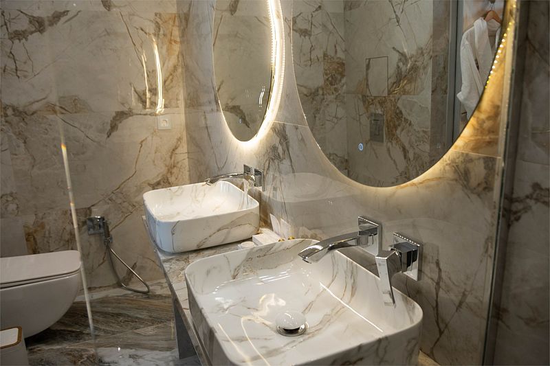 Ванная комната, оборудована ванной и душевой кабиной одновременно. Так же присутствует качественный текстиль — банные полотенца, банные принадлежности (мыло, гель для душа, лосьон для тела, шампунь для волос, кондиционер для волос, шапочка для душа, расческа), туалетные средства (зубной набор — зубная щетка + паста, бритвенный набор — станок одноразовый + крем для бритья), ватные палочки и диски, пляжные полотенца, раковина, санузел, биде, тапочки, халаты, фен. Смена полотенец происходит каждый день, смена постельного белья 1 раз в 3 суток.