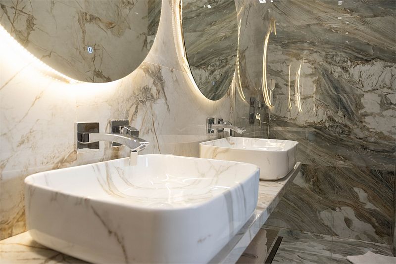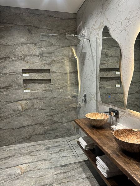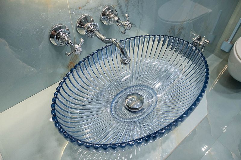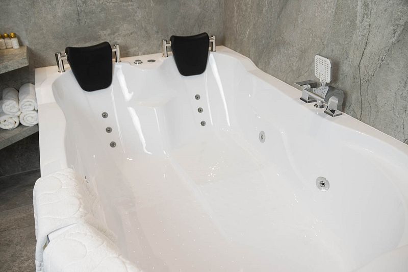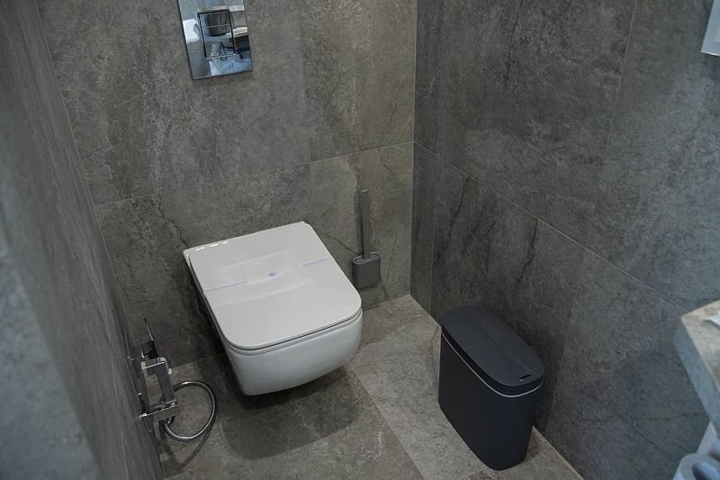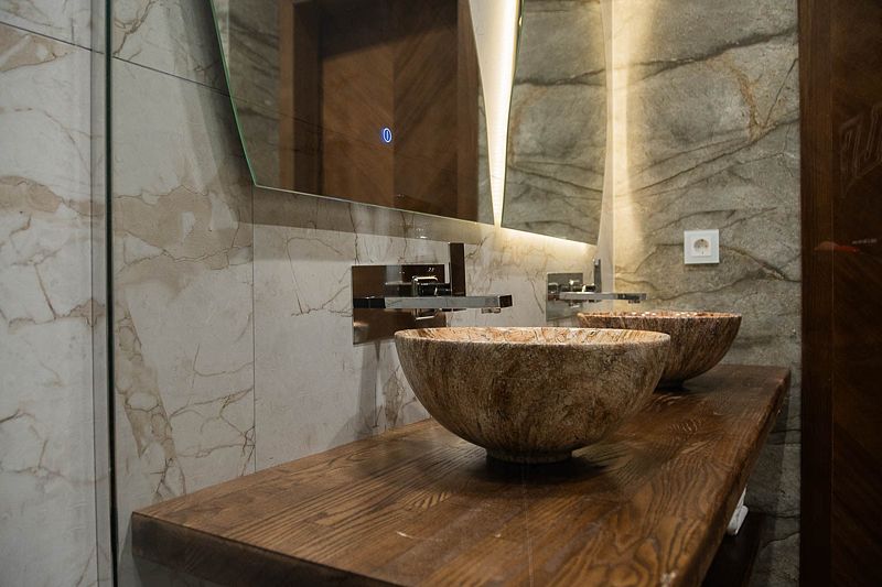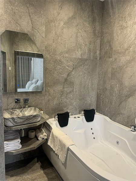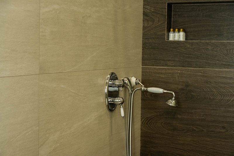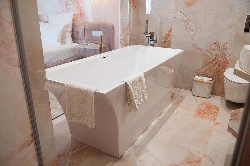 Ванная комната, оборудована ванной и душевой кабиной одновременно. Так же присутствует качественный текстиль — банные полотенца, банные принадлежности (мыло, гель для душа, лосьон для тела, шампунь для волос, кондиционер для волос, шапочка для душа, расческа), туалетные средства (зубной набор — зубная щетка + паста, бритвенный набор — станок одноразовый + крем для бритья), ватные палочки и диски, пляжные полотенца, раковина, санузел, биде, тапочки, халаты, фен. Смена полотенец происходит каждый день, смена постельного белья 1 раз в 3 суток.