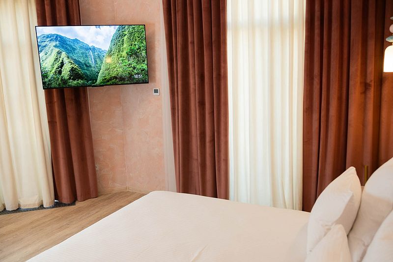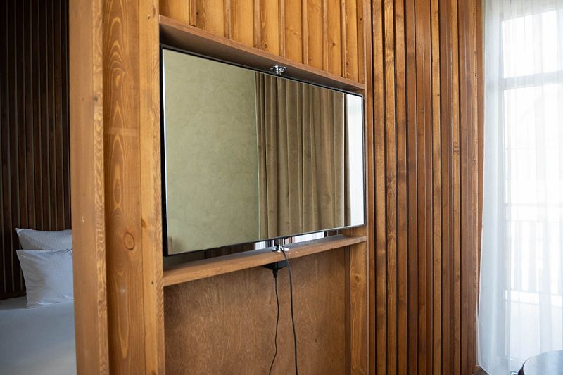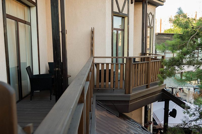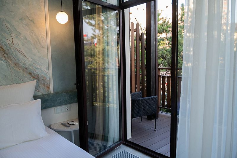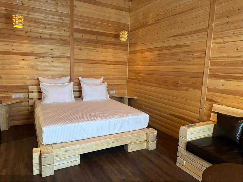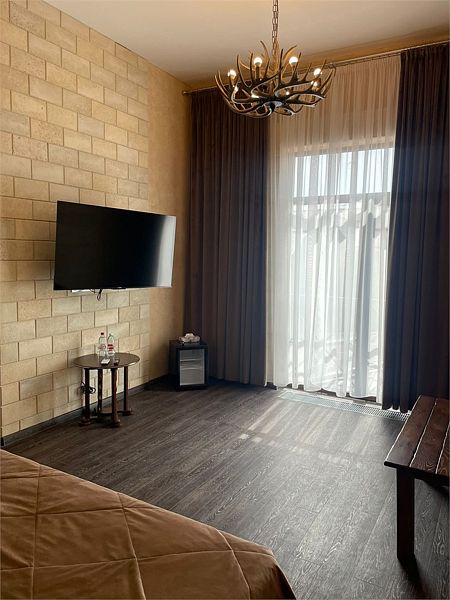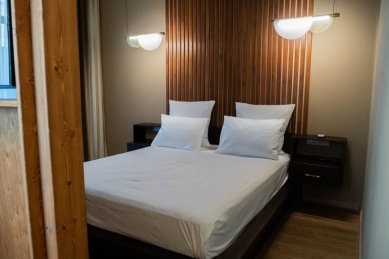 Авторский дизайн номера выполнен в изысканном современном стиле с применением экологичных материалов и рассчитан на комфортное проживание двух гостей. Здесь находится все необходимое для прекрасного отдыха. Помимо широкой двуспальной кровати с ортопедическим матрасом и другой современной мебели, к услугам гостей SMART-TV, внутренний телефон и бесплатный Wi-Fi. Изюминка номера — интерьер, выполненный в стиле Шале. Имеется санузел, который оснащен душем, феном и высококачественным текстилем.