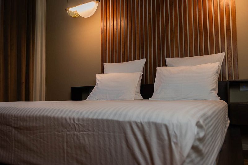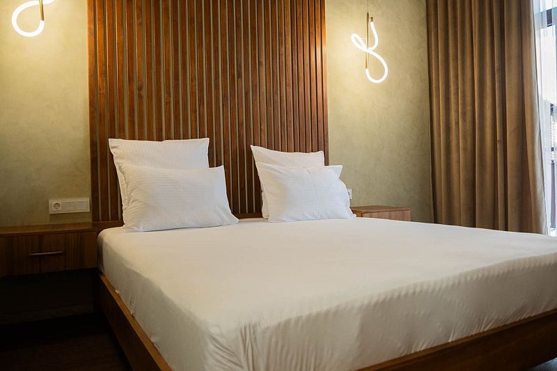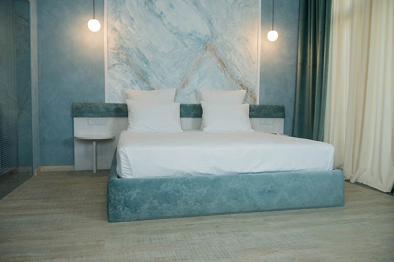 Авторский дизайн номера выполнен в изысканном современном стиле с применением экологичных материалов и рассчитан на комфортное проживание двух гостей. Здесь находится всё необходимое для прекрасного отдыха. Помимо широкой двуспальной кровати с ортопедическим матрасом и другой современной мебели, к услугам гостей SMART-TV, внутренний телефон и бесплатный Wi-Fi. Изюминка номера — санузел для 2-х, который оснащен парными раковинами для умывания, душем, феном и высококачественным текстилем.