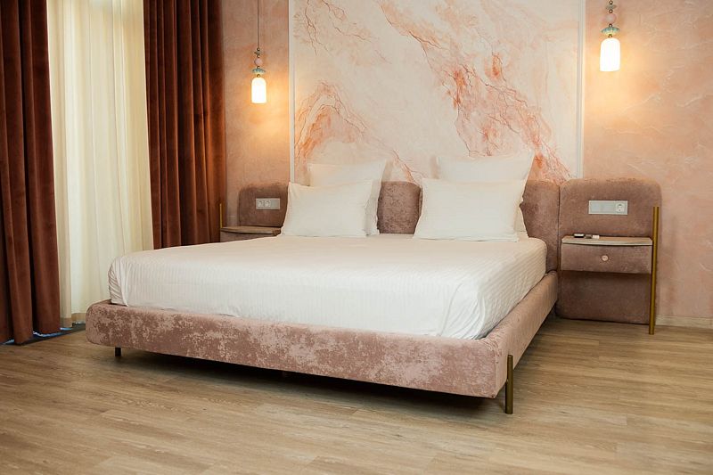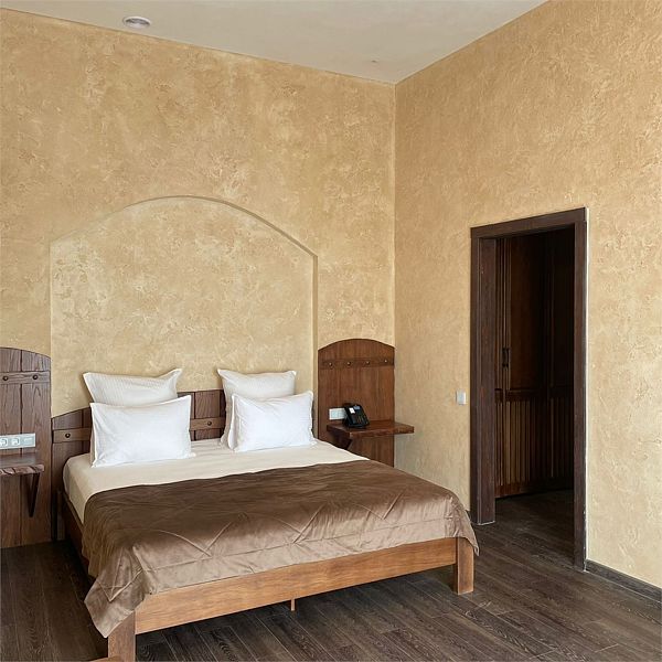 Авторский дизайн номера выполнен в изысканном современном стиле с применением экологичных материалов и рассчитан на комфортное проживание двух гостей. Здесь находится всё необходимое для прекрасного отдыха. Помимо широкой двуспальной кровати с ортопедическим матрасом и другой современной мебели, к услугам гостей SMART-TV, внутренний телефон и бесплатный Wi-Fi. Изюминка номера — парный санузел с двумя раковинами, оснащен душем, феном и высококачественным текстилем.