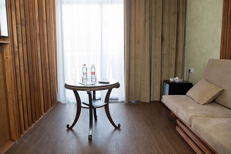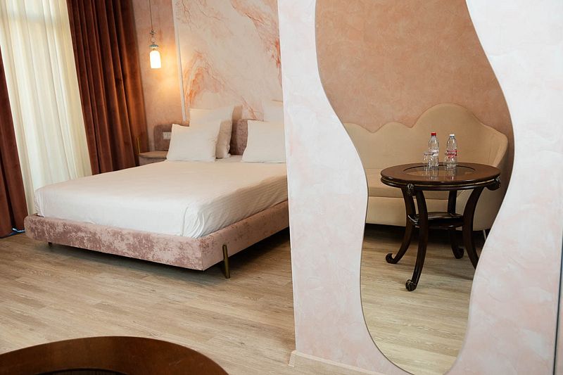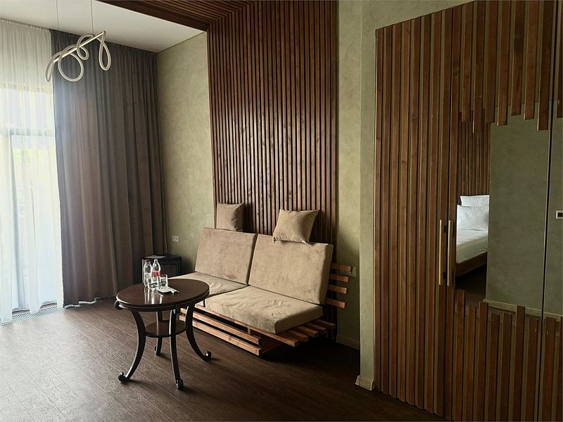 Номер 201 с Авторским дизайном категории Джуниор Сьют располагаются на втором этаже в Главном корпусе №1. Корпус реновирован в июне 2024 года, здесь же располагается Ресепшн отеля и кафе, где проходят завтраки и обеды.