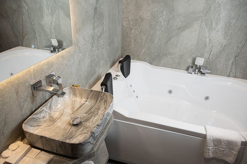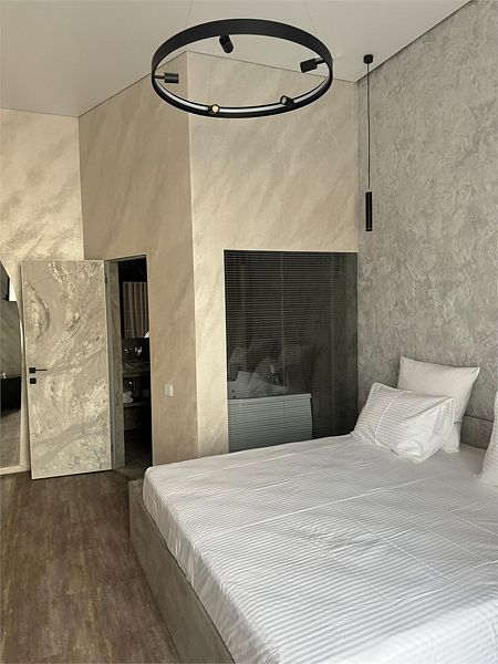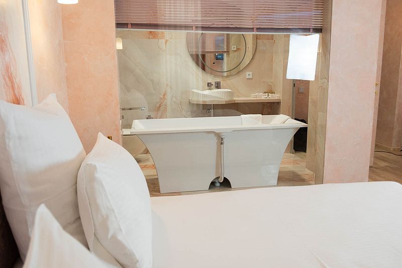 Авторский дизайн номера выполнен в изысканном современном стиле с применением экологичных материалов и рассчитан на комфортное проживание двух гостей. Здесь находится всё необходимое для прекрасного отдыха. Помимо широкой двуспальной кровати с ортопедическим матрасом и другой современной мебели, к услугам гостей SMART-TV, внутренний телефон и бесплатный Wi-Fi. Изюминка номера — «прозрачный санузел», который оснащен ванной на двоих с джакузи, феном и высококачественным текстилем.