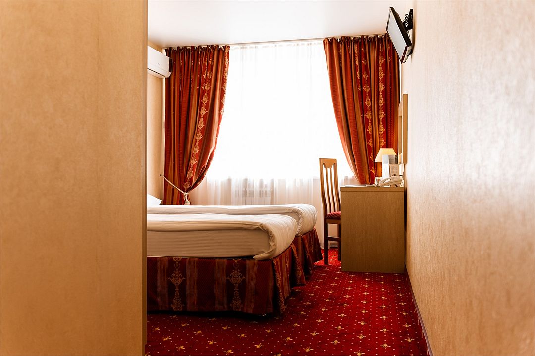 телевизор, кабельное телевидение, Wi-Fi, телефон, холодильник, кондиционер, светильник, настольные лампы, фен, электронные замки, ванна или душевая кабина, банные полотенца, две односпальные или большая двуспальная кровать, стулья, шкаф для одежды, вешалки, письменный стол, багажная тумба, зеркало, чайный набор, обслуживание номеров, ковровое покрытие, вид на город, кулер на этаже, вид во двор, без питомцевВ гостиничном номере