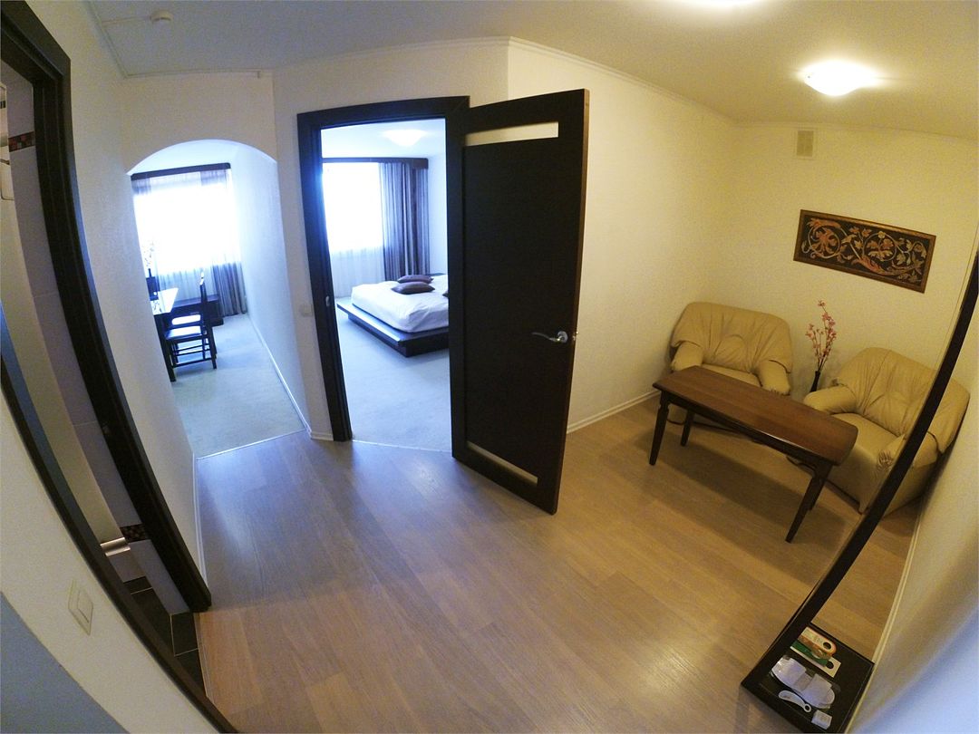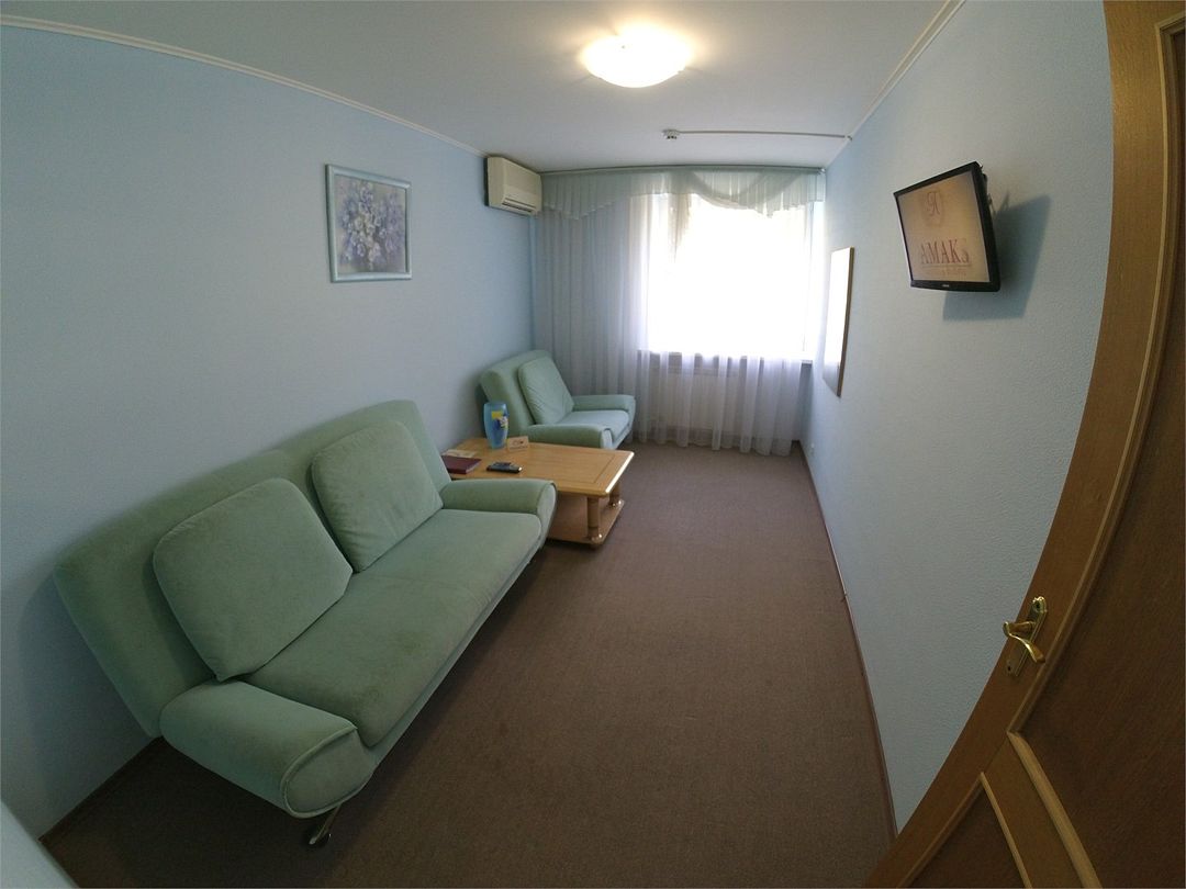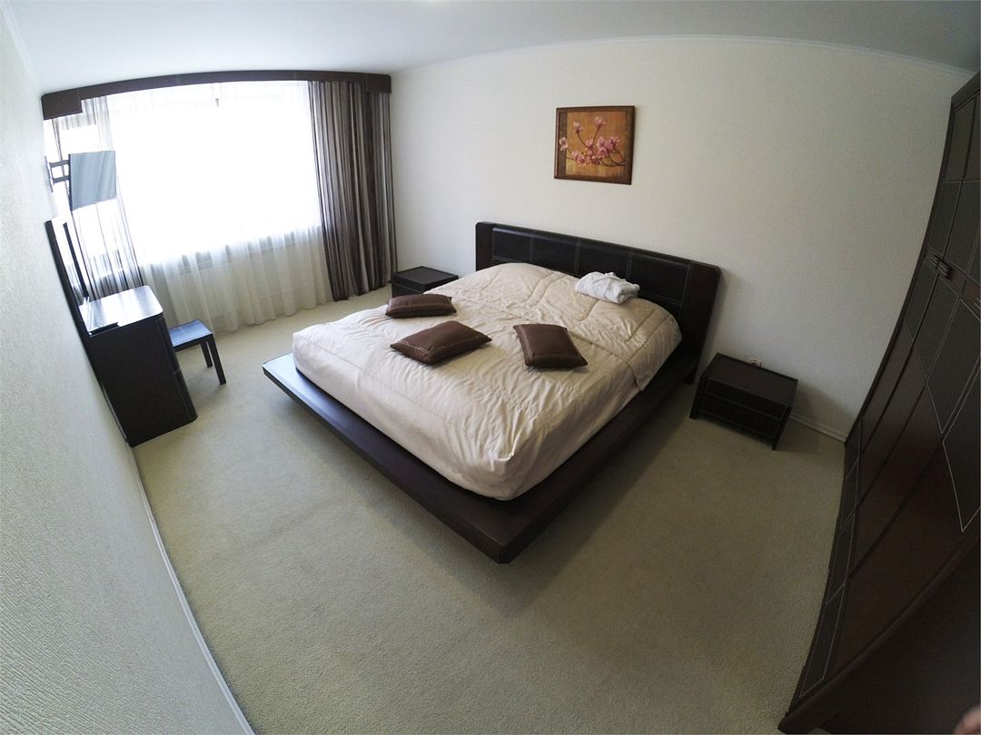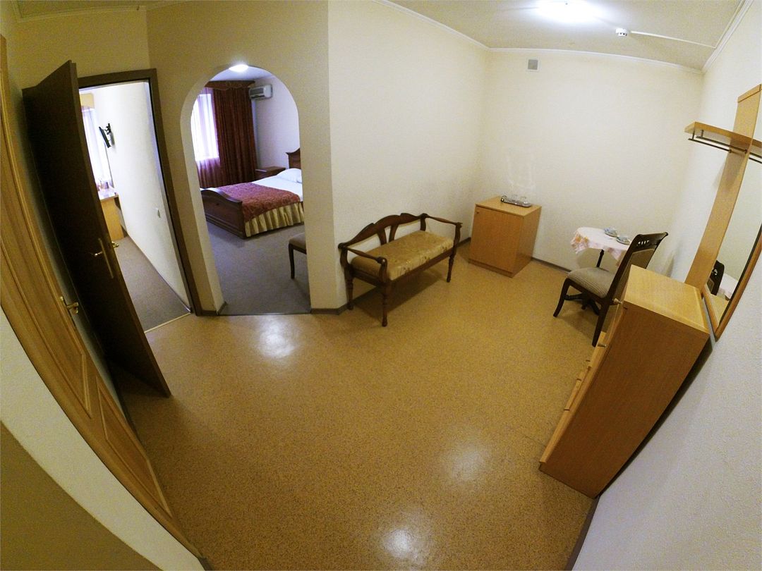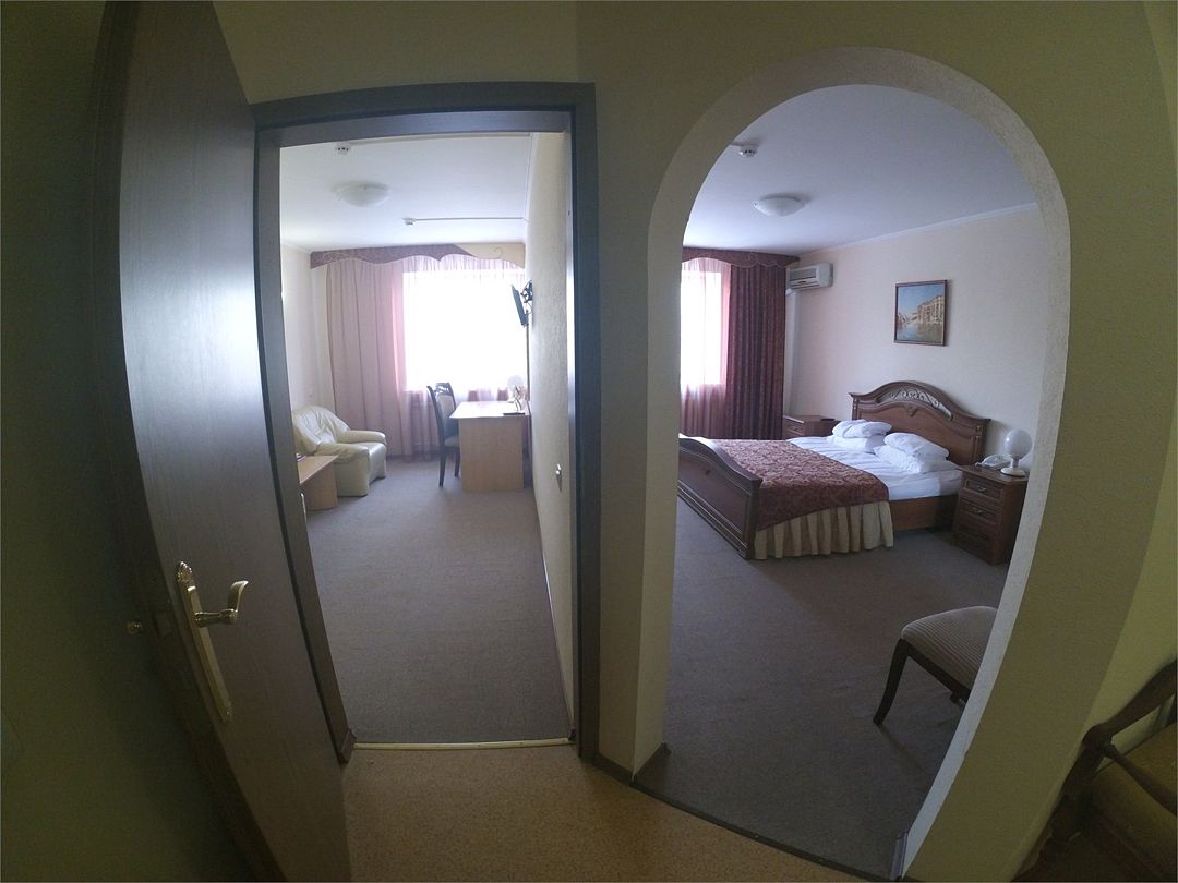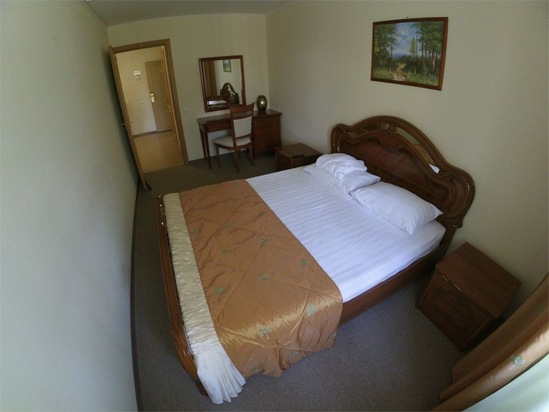 Комфортабельный номер, площадью 45 кв.м., двуспальная кровать, в некоторых номерах - зона с мягкой мебелью, телевизор, кондиционер, холодильник, телефон, сейф, Wi-Fi.Услуги и удобства