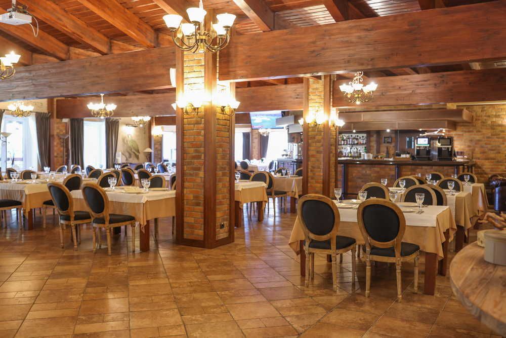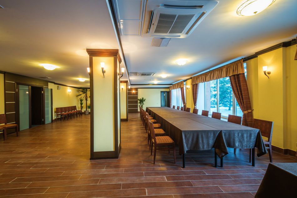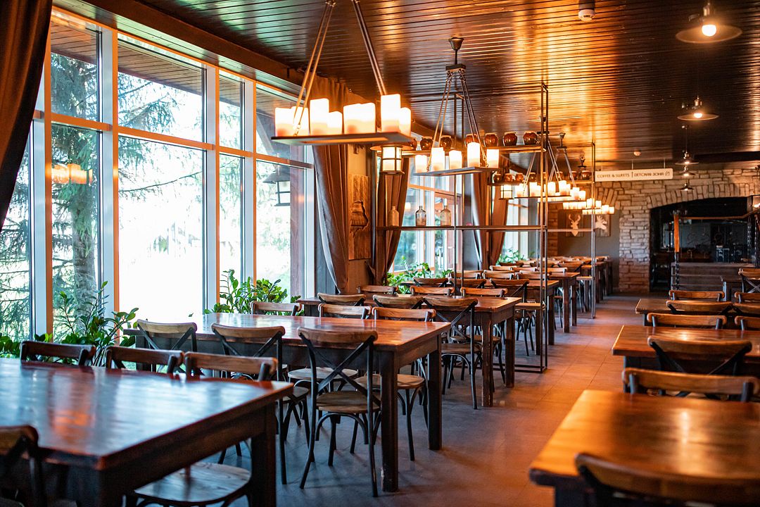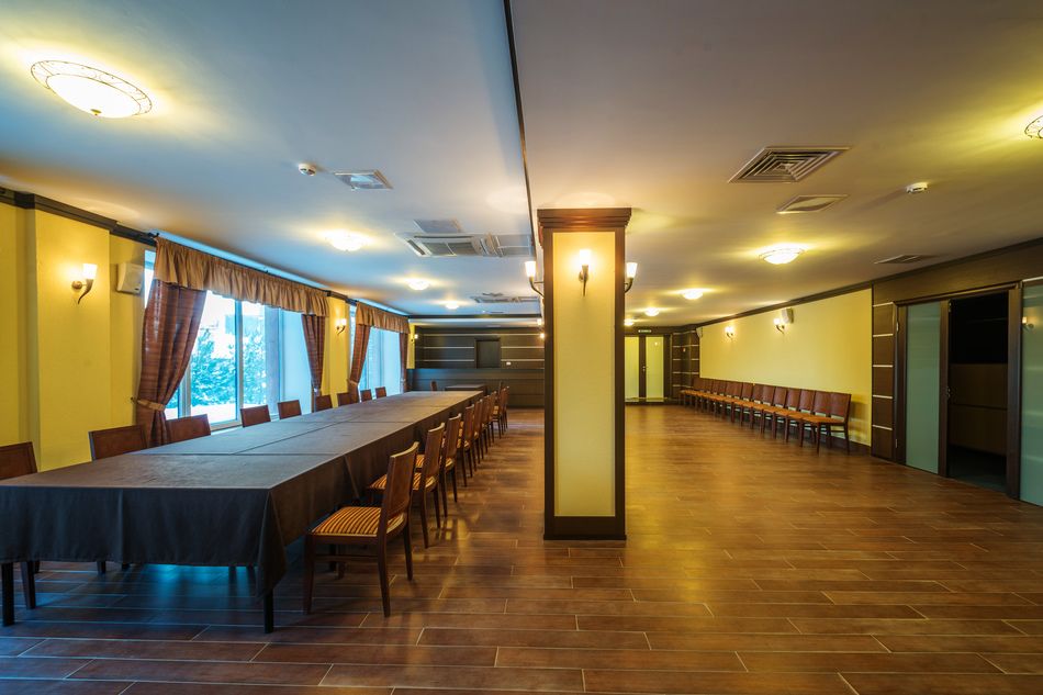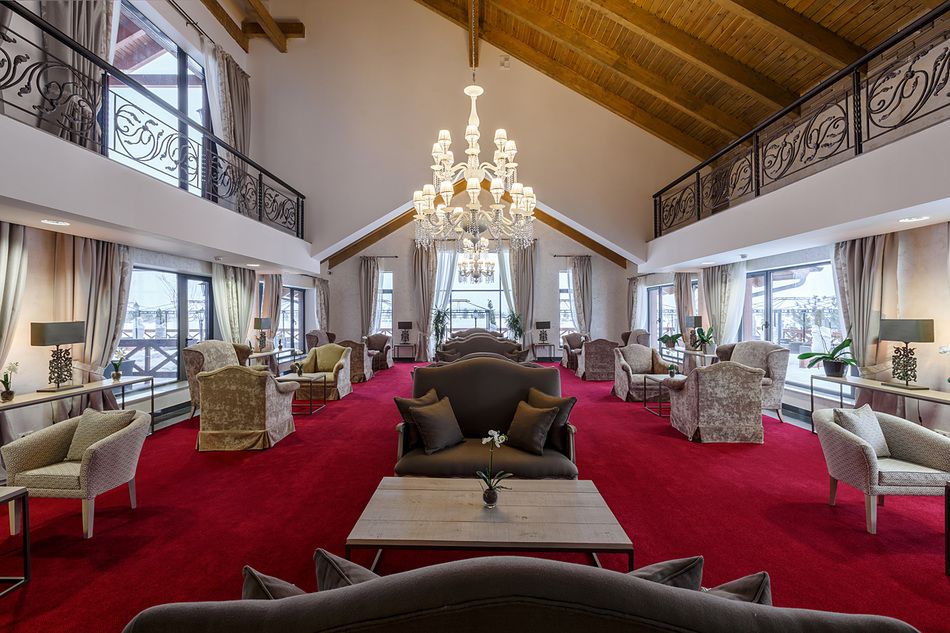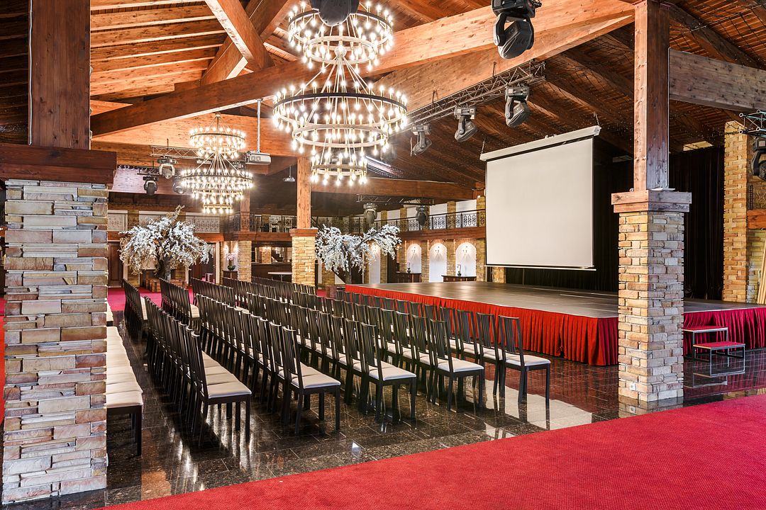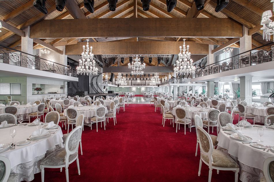Роскошный зал, достойный самых пышных торжеств, будь то свадьба, юбилей или любой другой повод для праздника и веселья! Интерьер зала сочетает в себе элементы горного шале и модерна: шикарные люстры, элегантная мебель и сервировка, мягчайшие ковровые дорожки и огромные 6-метровые окна в пол. Такое оформление не оставит равнодушным ни одного из Ваших гостей. Дополнительно в зале есть второй этаж, который можно использовать для рассадки гостей, а также в качестве зоны отдыха.
