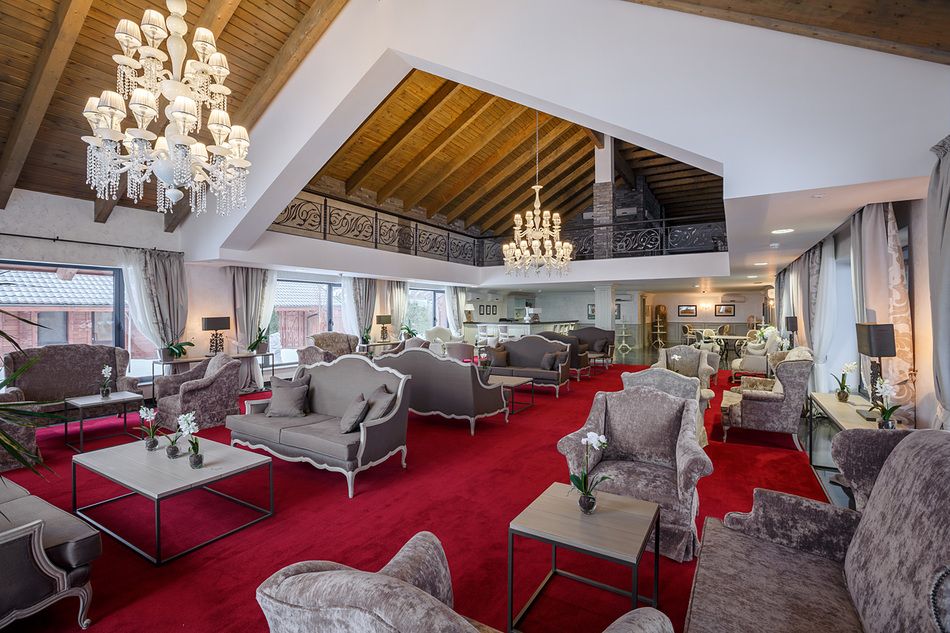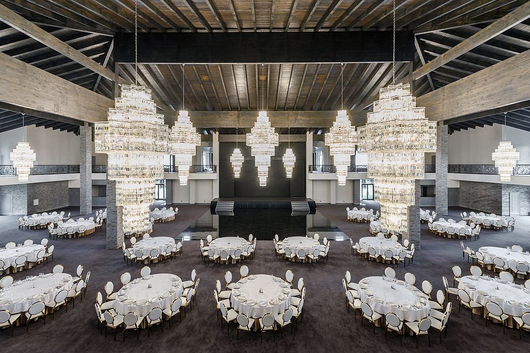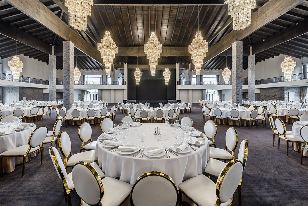Стилистика зала погружает в атмосферу современной роскоши: стильная мебель, шикарные люстры, 2-х этажная приветственная зона и сервис высшего уровня.