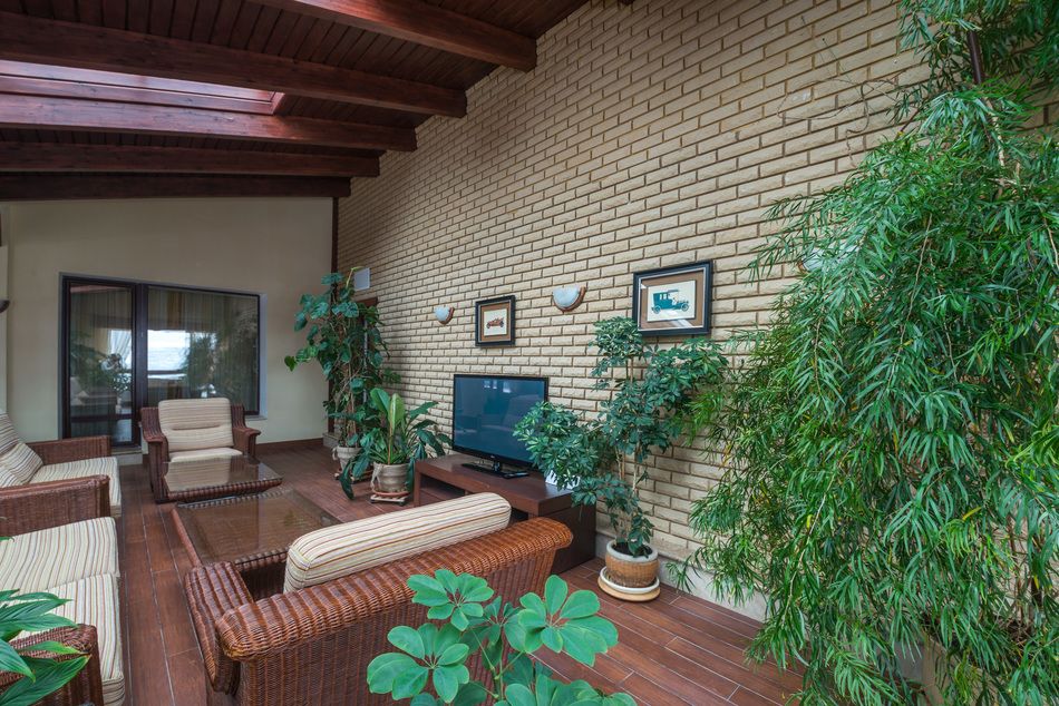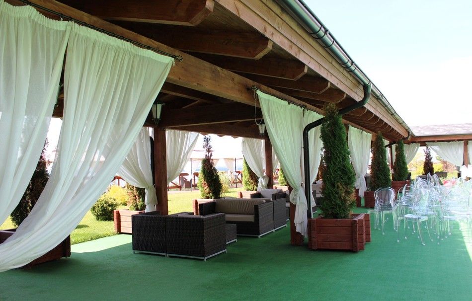 Просторная летняя терраса с шатрами и комфортабельной мебелью позволит вашим гостям получить истинное удовольствие от вашего праздника.