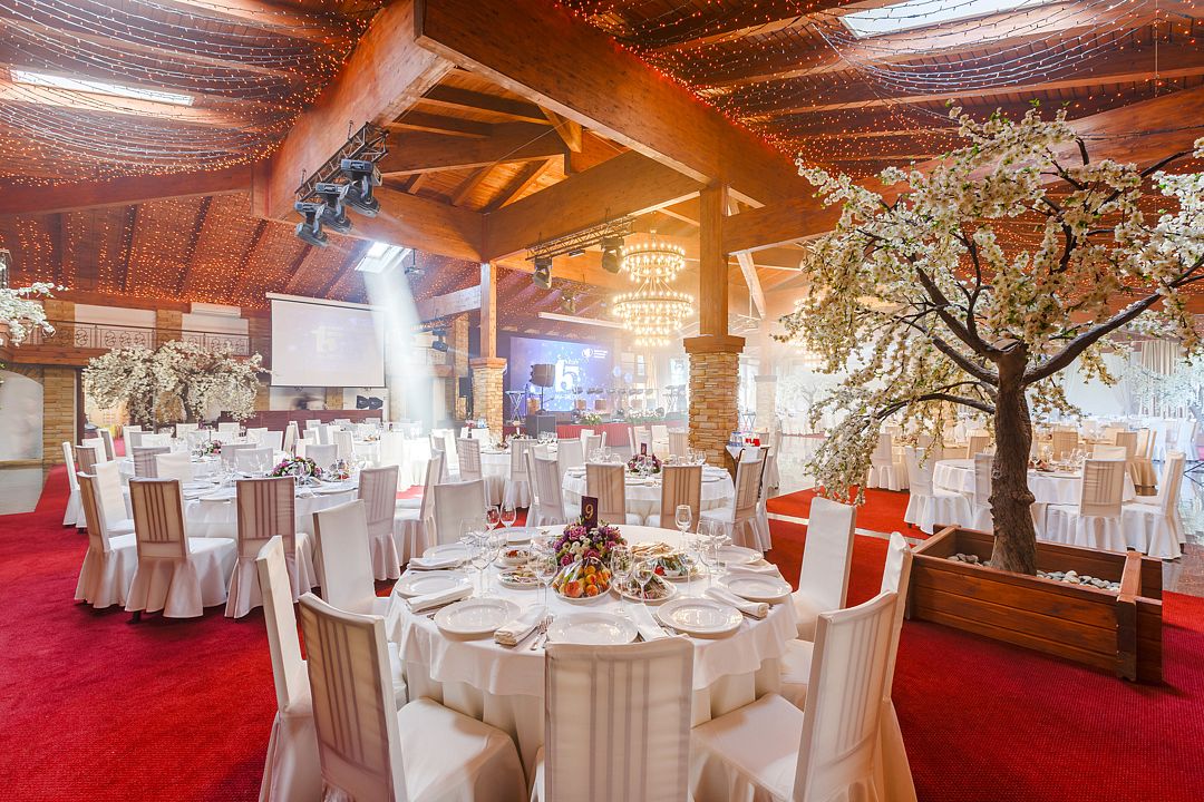 Зал идеально подходит для проведения красивой и изысканной свадьбы, яркого юбилея или большого и шумного корпоративного праздника.