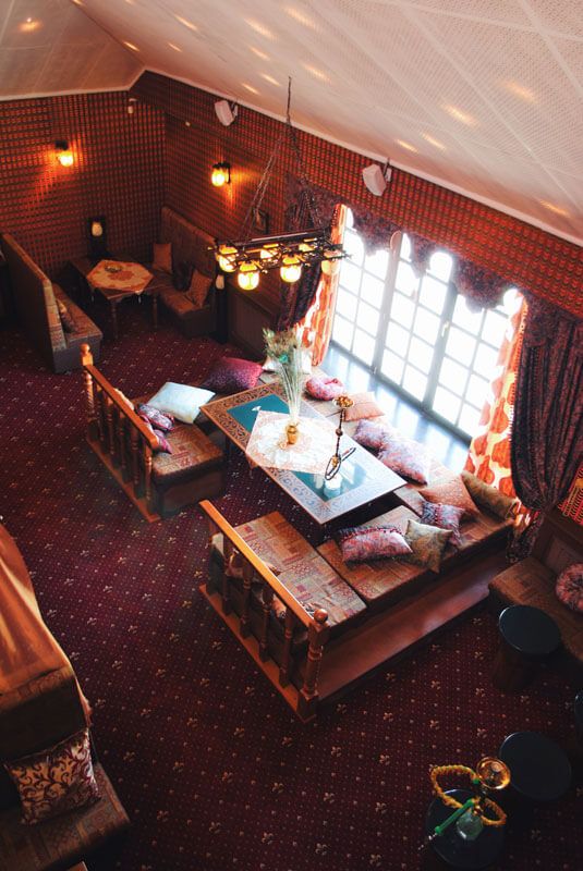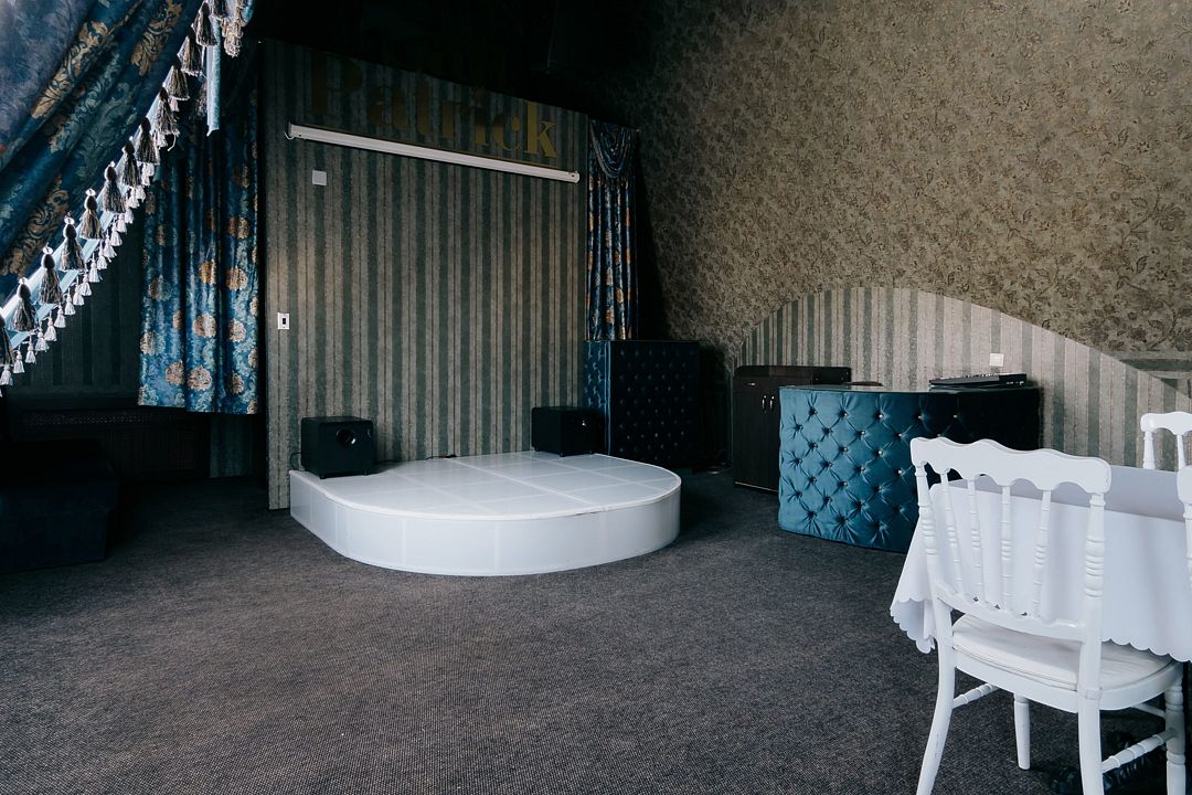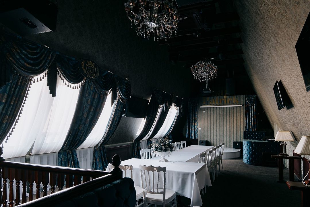 Купольный потолок при входе в зал, классические портьеры, дубовый паркет. Зал разделен на зоны - в одной части люди веселятся, в другой могут отдохнуть на мягких диванах.