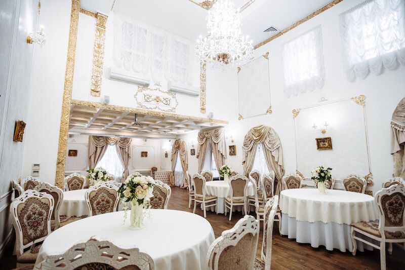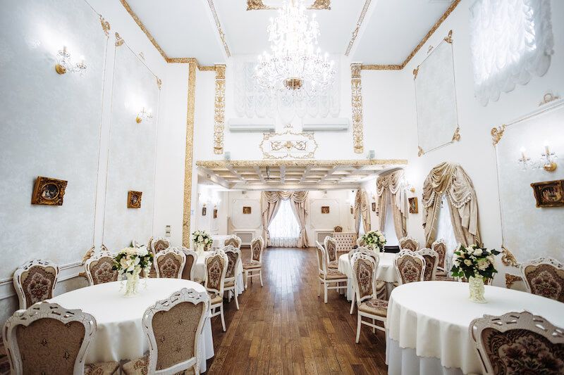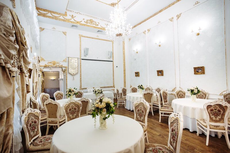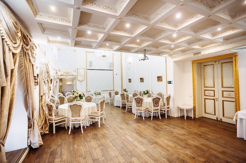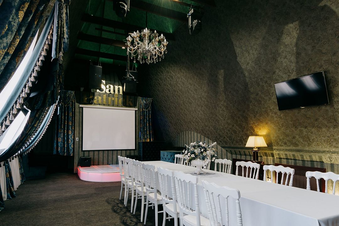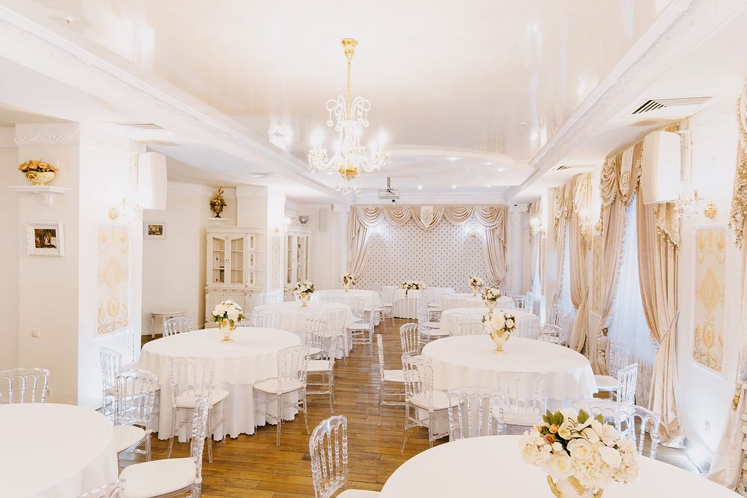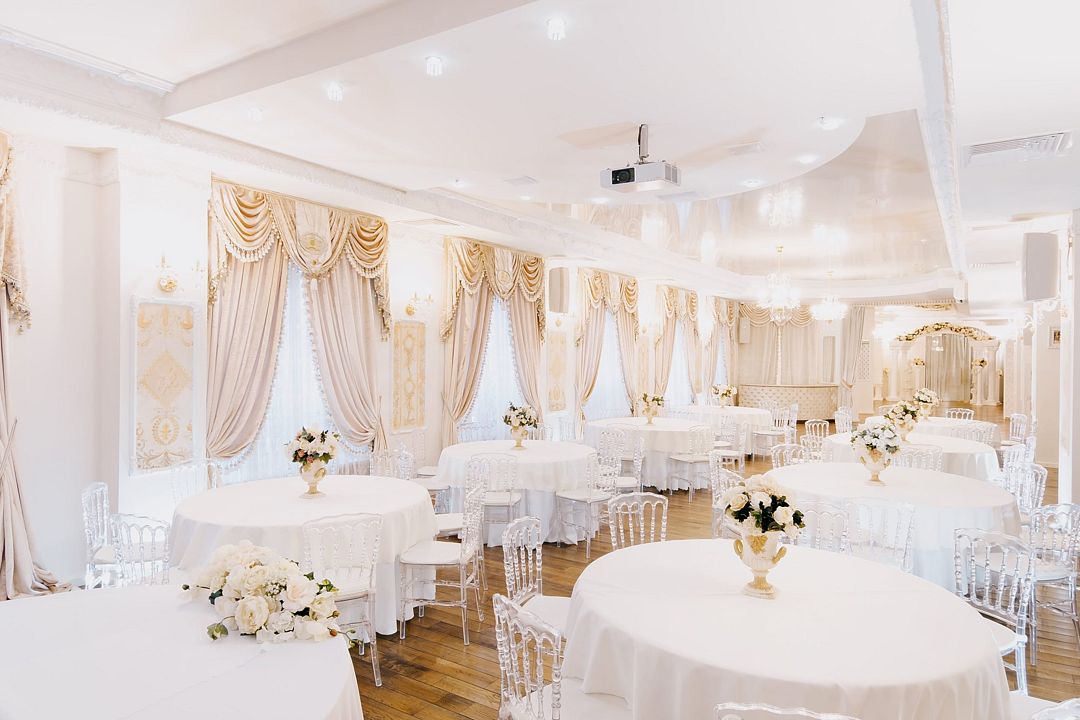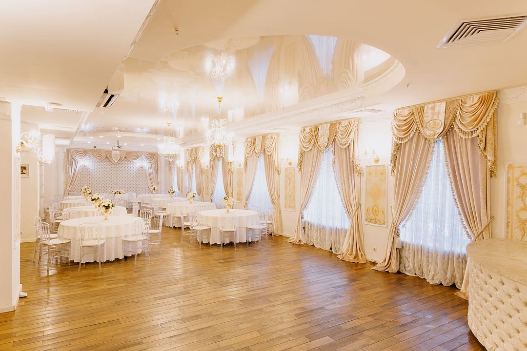 Лепнина на стенах, большая дворцовая люстра и хрустальные светильники, выход на балкон. Есть все необходимое оборудование: звуковое, музыкальное, проектор и экран.