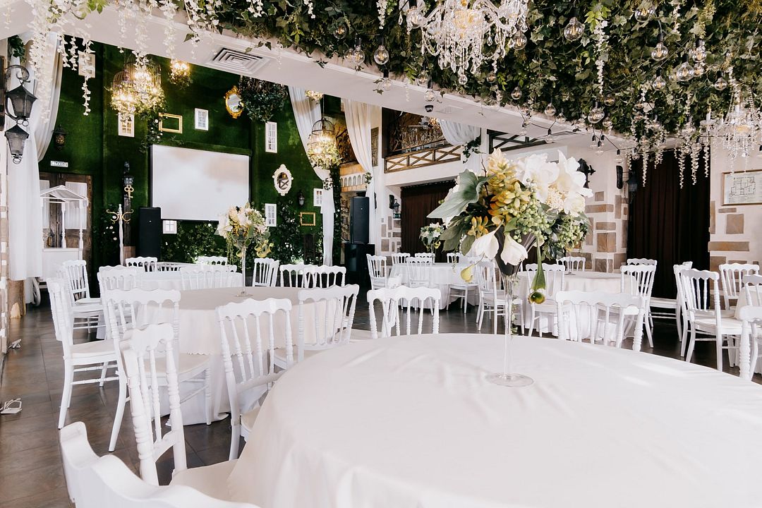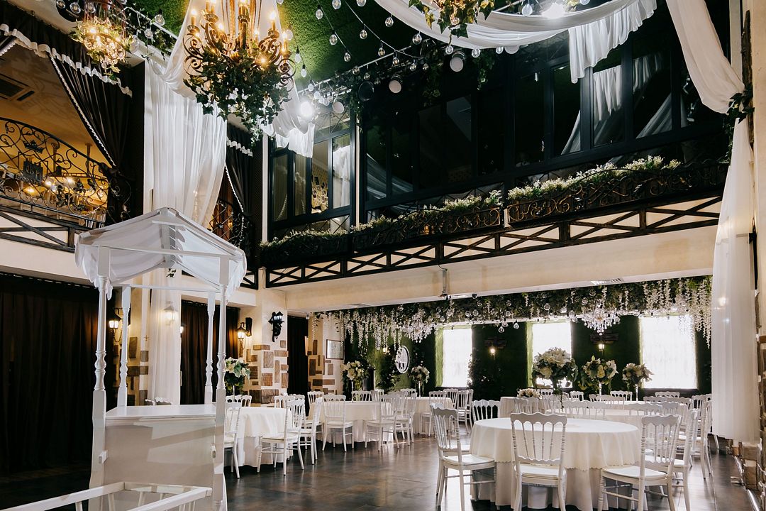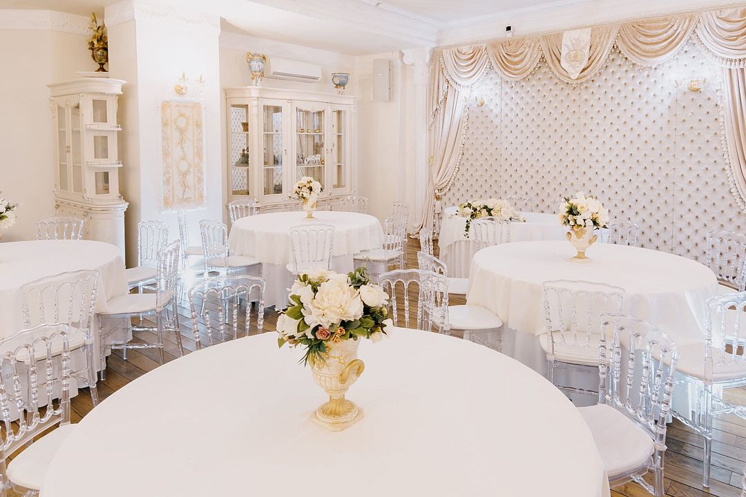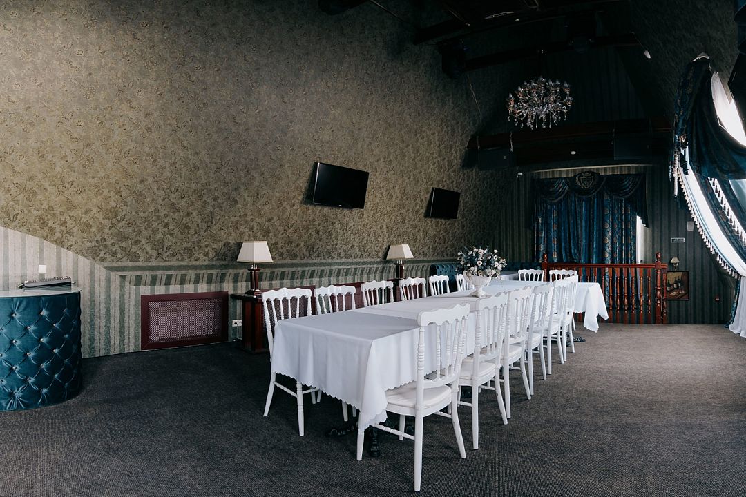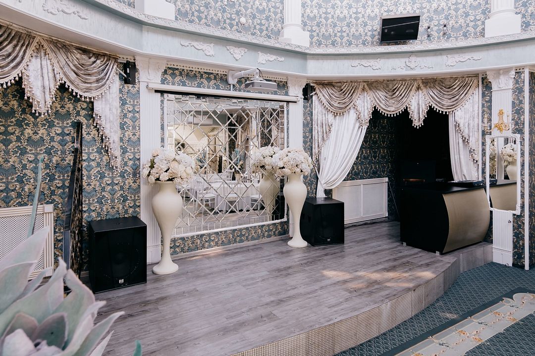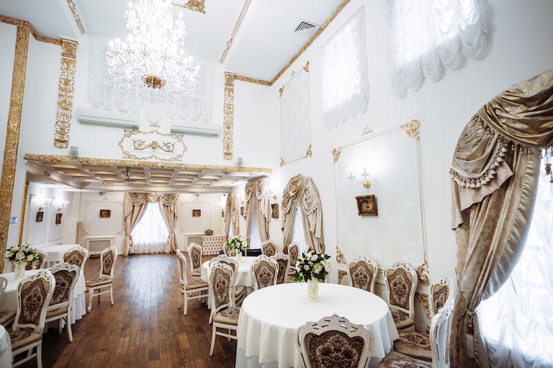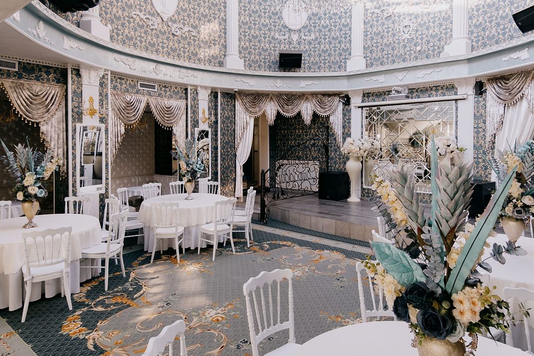 Лепнина на стенах, большая дворцовая люстра и хрустальные светильники, выход на балкон. Есть все необходимое оборудование: звуковое, музыкальное, проектор и экран.