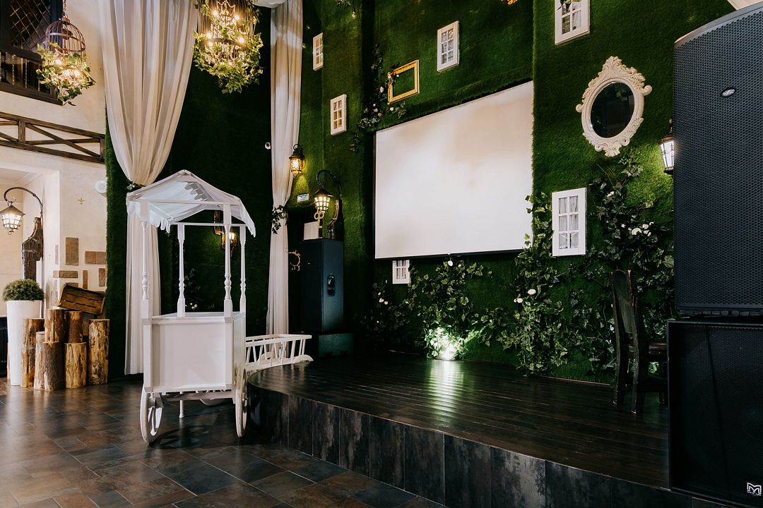 Оформлен в лесном стиле, люстры в виде подвесных клеток. Есть все необходимое оборудование: звуковое, музыкальное, проектор и экран.