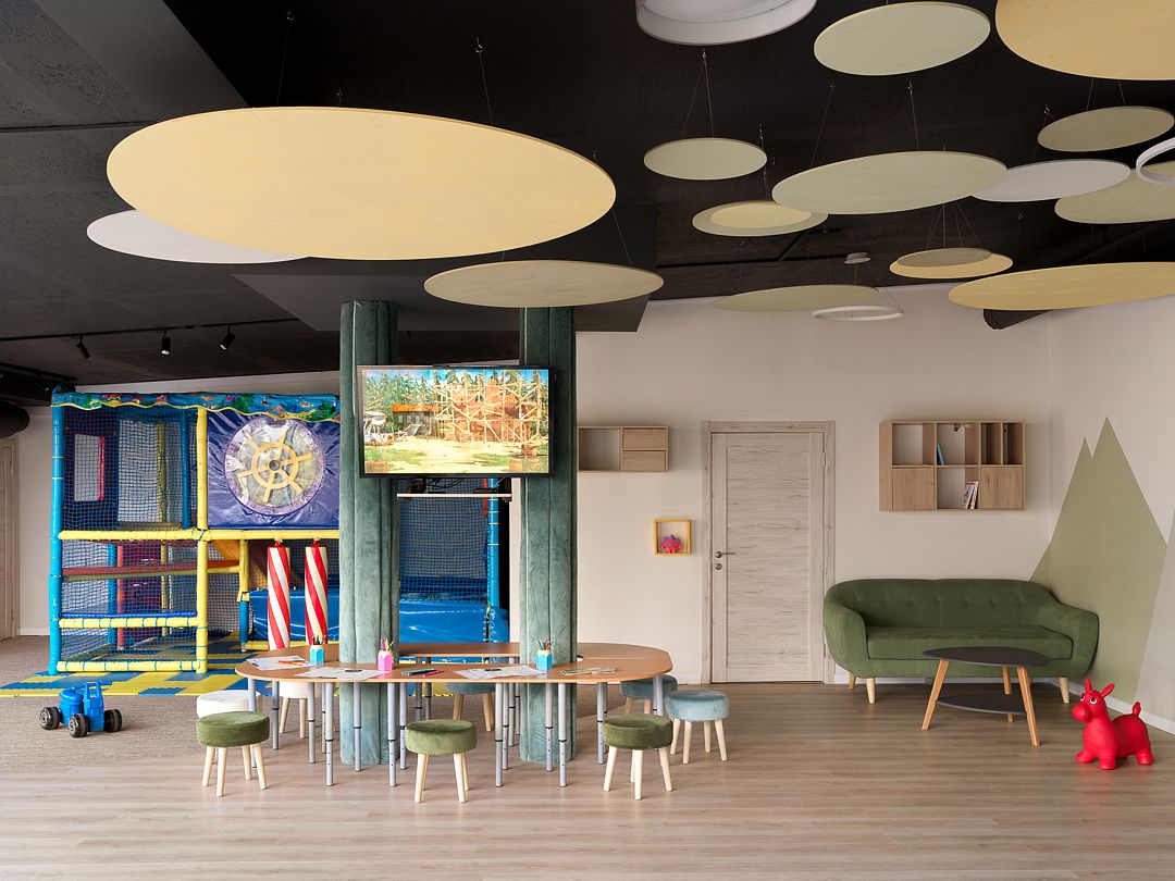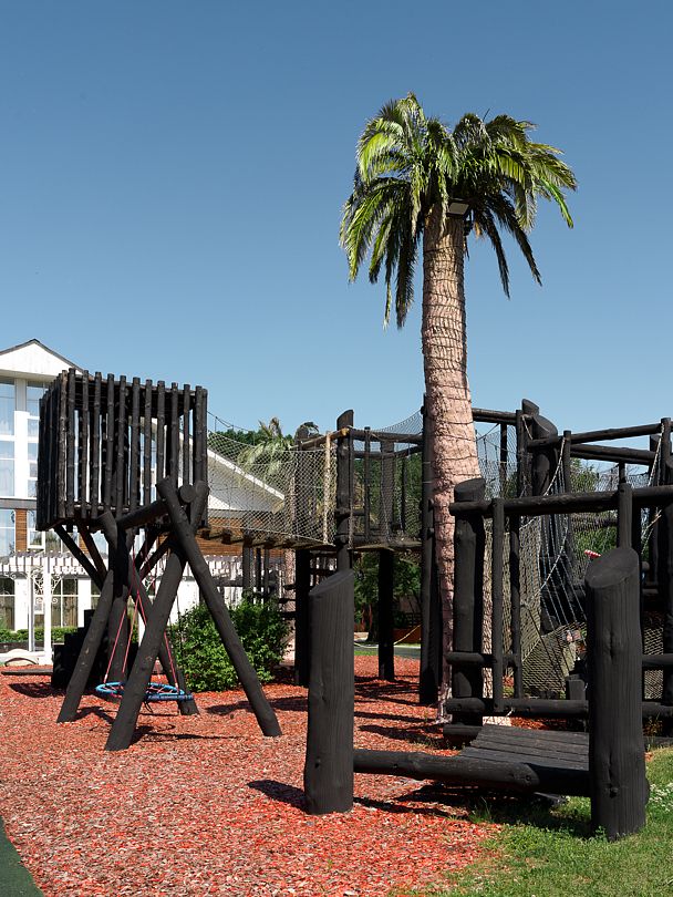 Для детей есть прекрасная детская площадка с батутом и городком, предоставляется услуга няни, работает детский клуб с разнообразными активностями, ежедневно проходит пенная вечеринка.