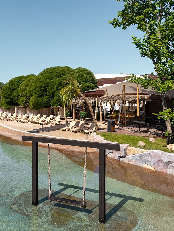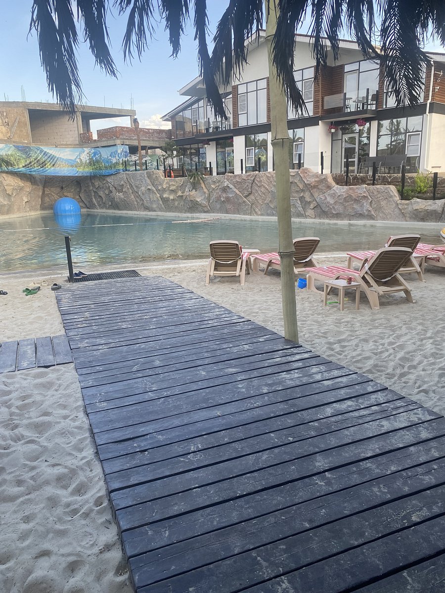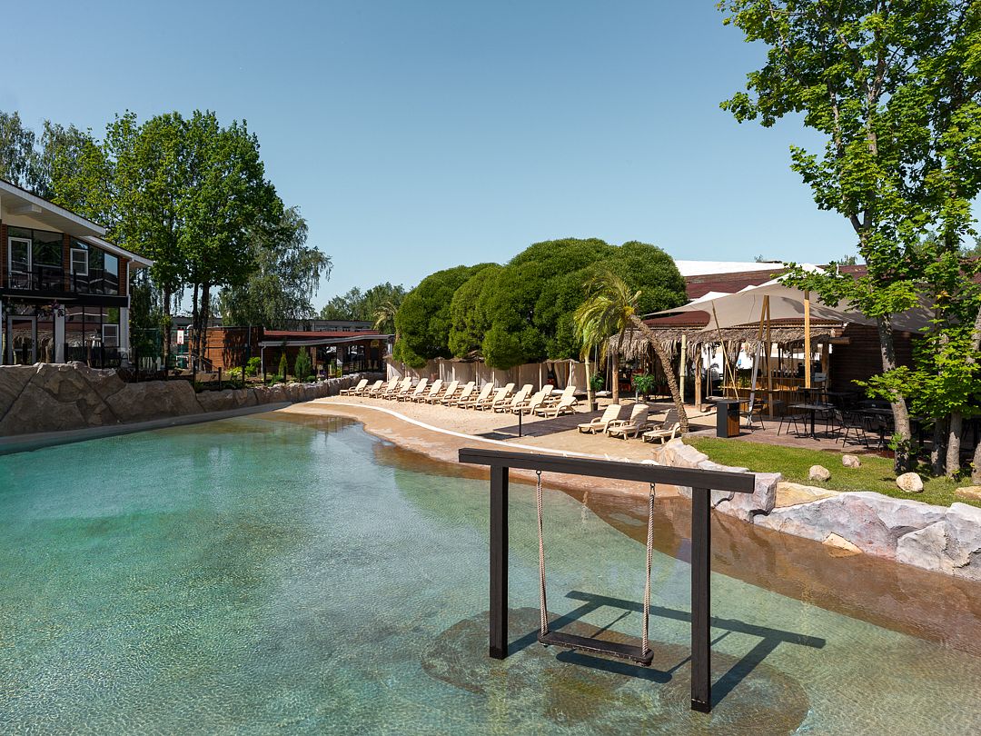 Песчаный пляж очень живописный, со свежей водой, искусственной волной и качелью.