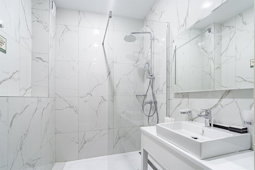 В номере находится одна большая кровать, либо две раздельные; большой телевизор; кондиционер; раскладывающийся диван; вместительный шкаф; туалетный столик. Номер оснащен холодильником, электрическим чайником и набором посуды. В большом сан.узле душевая кабина, ванные принадлежности.