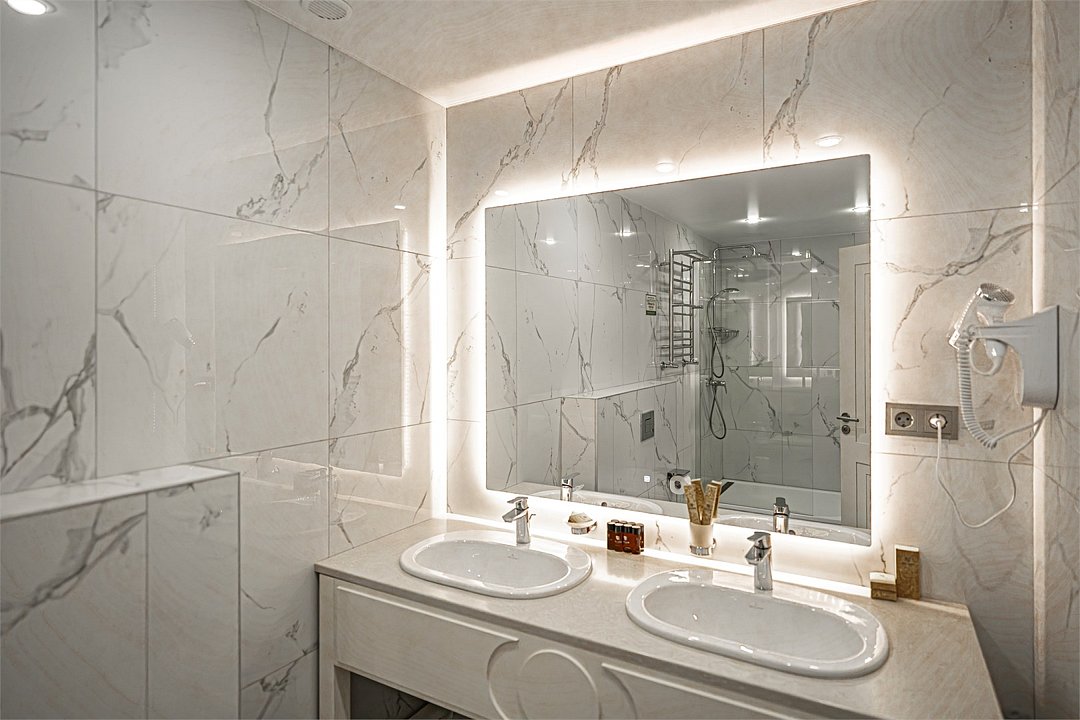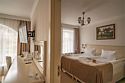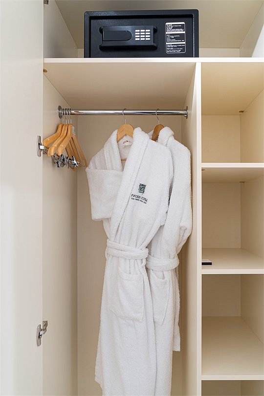 В номере находится одна большая кровать, либо две раздельные; двухместный диван; большой телевизор; кондиционер; раскладывающийся диван; вместительный шкаф; туалетный столик. Номер оснащен холодильником, электрическим чайником и набором посуды. В большом сан.узле душевая кабина, ванные принадлежности.
