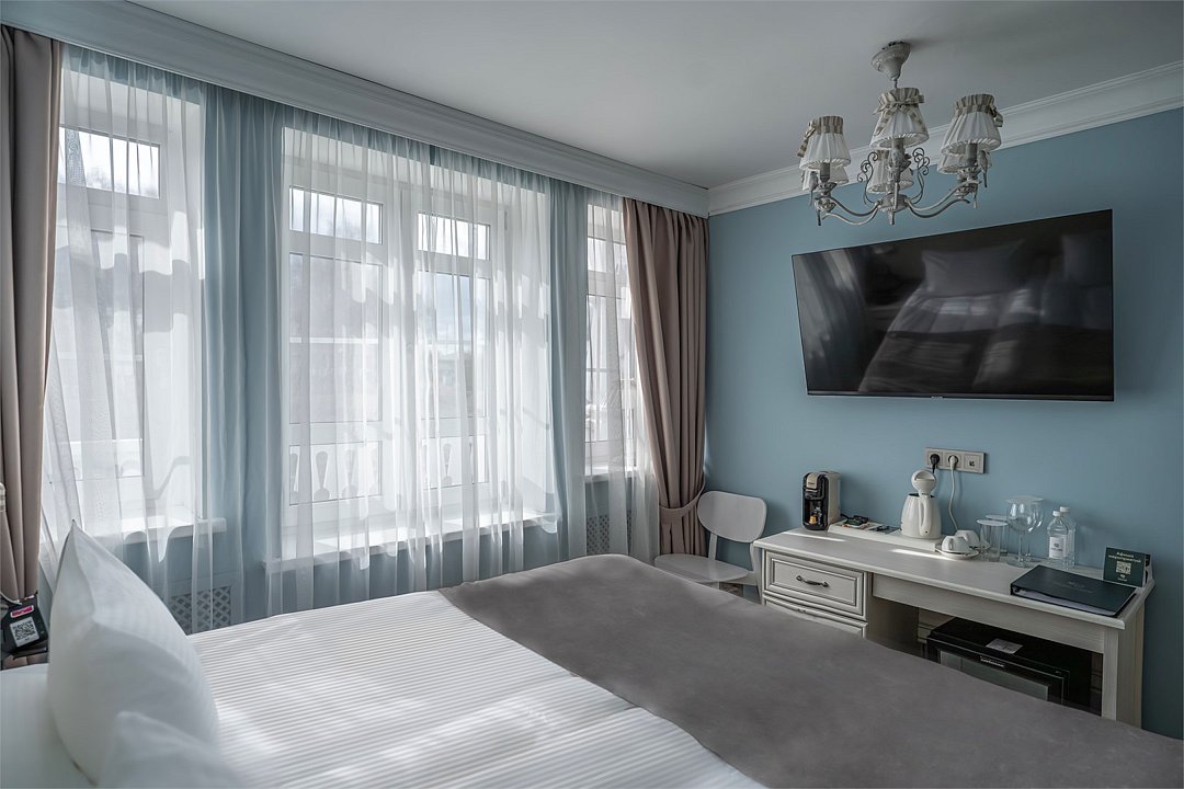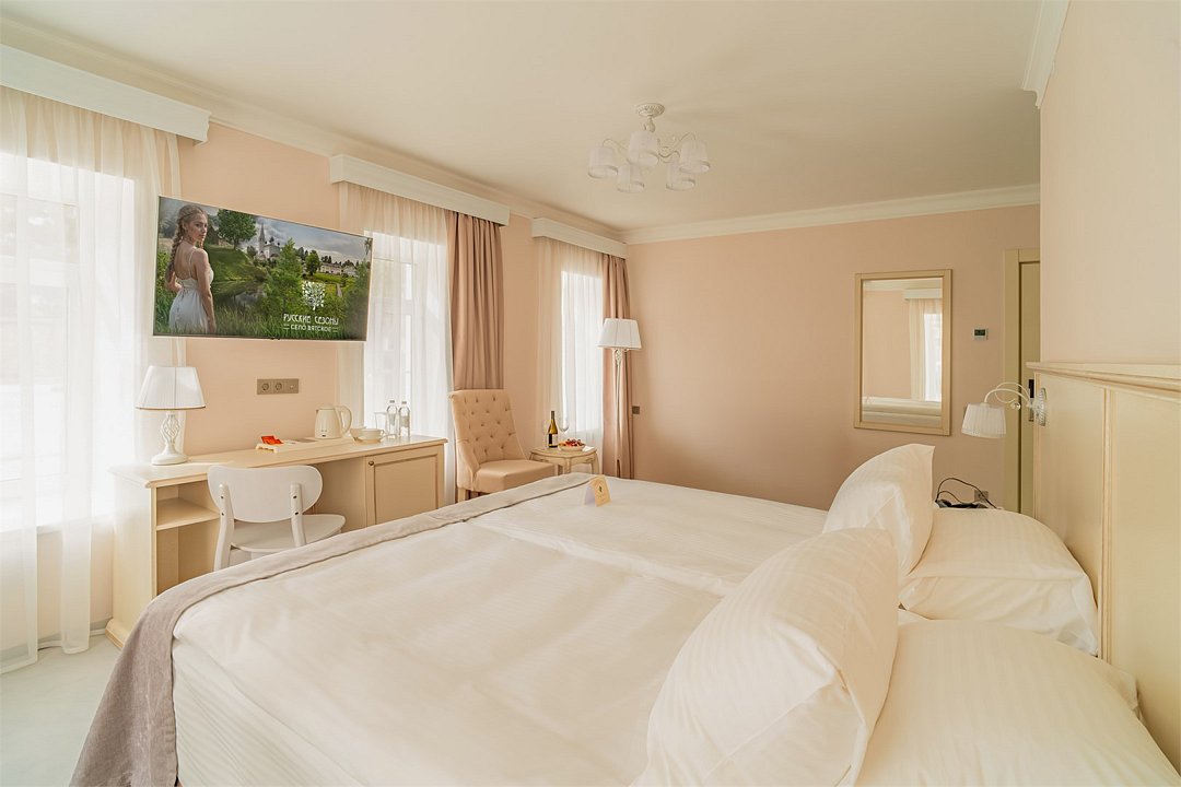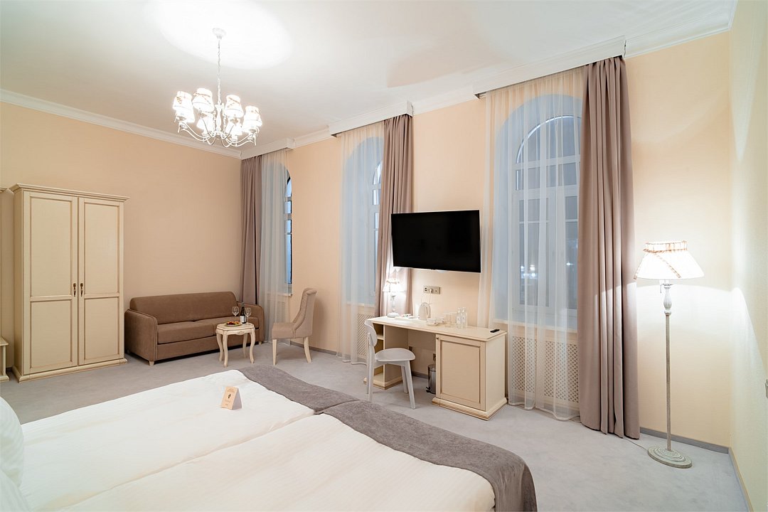 Просторный номер повышенной комфортности для двоих с двумя раздельными кроватями или с одной двуспальной кроватью. Номер расположен в главном музейном корпусе.