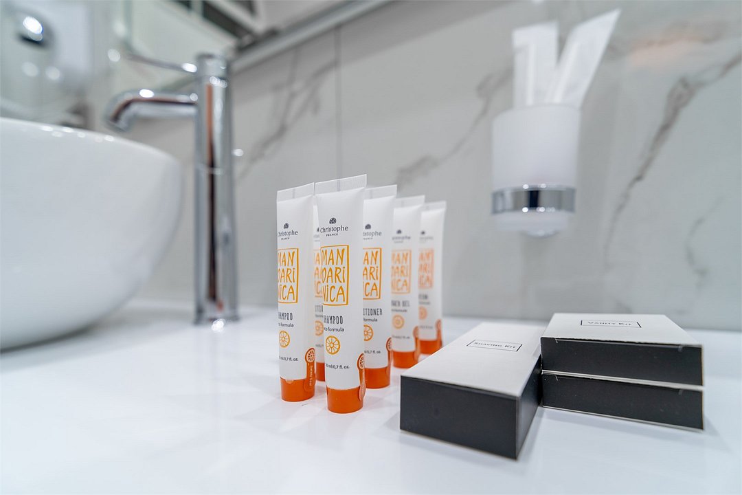 В номере находится одна большая кровать, либо две раздельные; раскладной диван; большой телевизор; кондиционер; раскладывающийся диван; вместительный шкаф; туалетный столик. Номер оснащен холодильником, электрическим чайником и набором посуды. В большом сан.узле душевая кабина, ванные принадлежности.