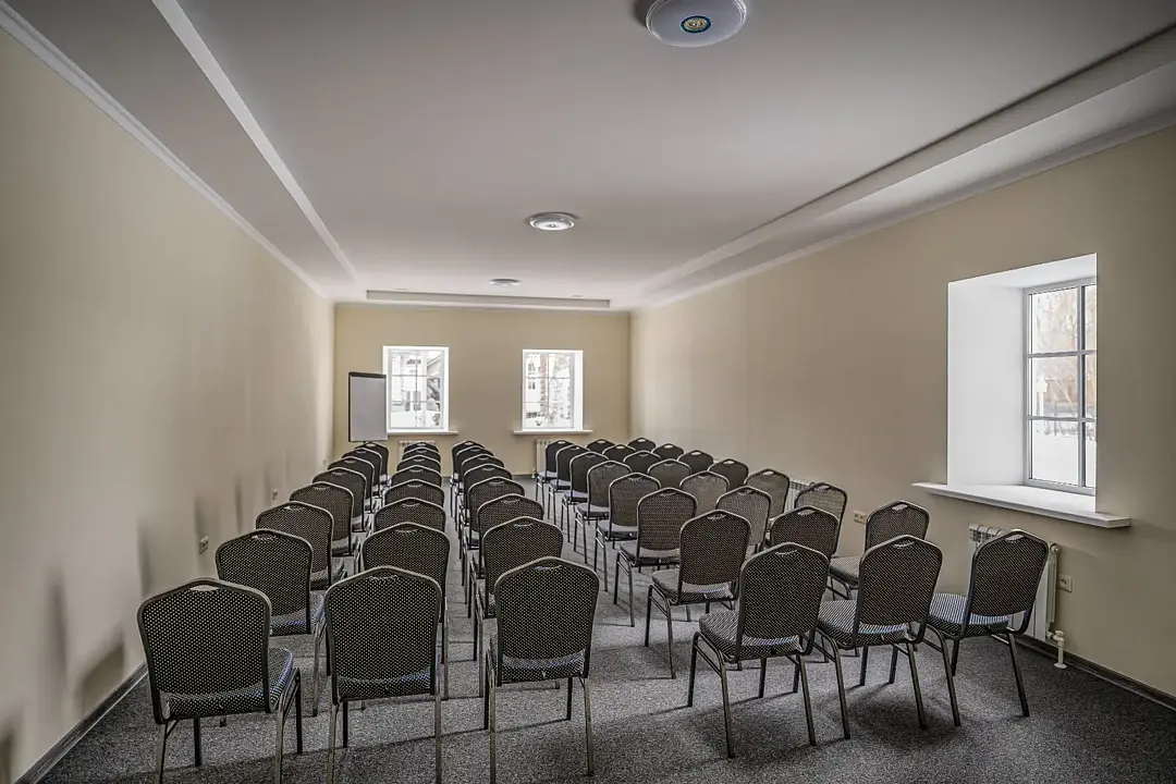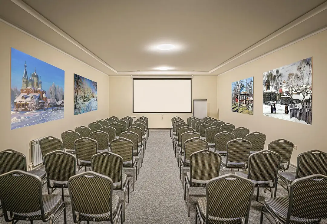 Просторный и светлый зал с дневным освещением оснащён всем необходимым оборудованием для небольших конференций и переговоров до 50 человек.