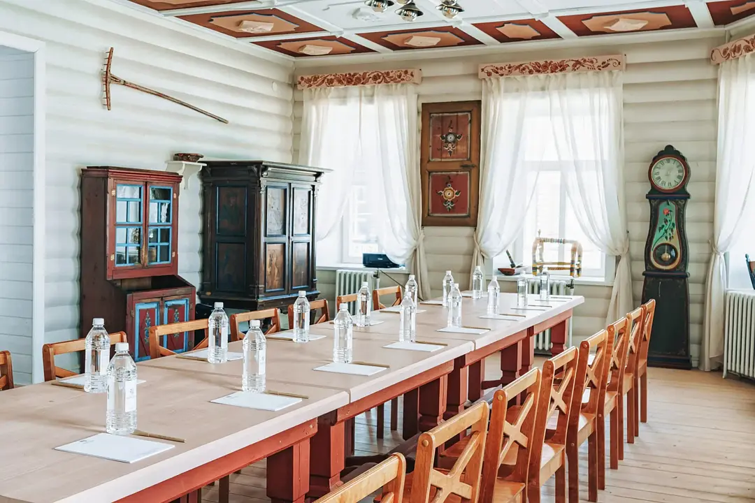 Стильный зал в старорусском стиле отличное решение для проведения мастер-классов и тренингов. Вместимость до 70 гостей.