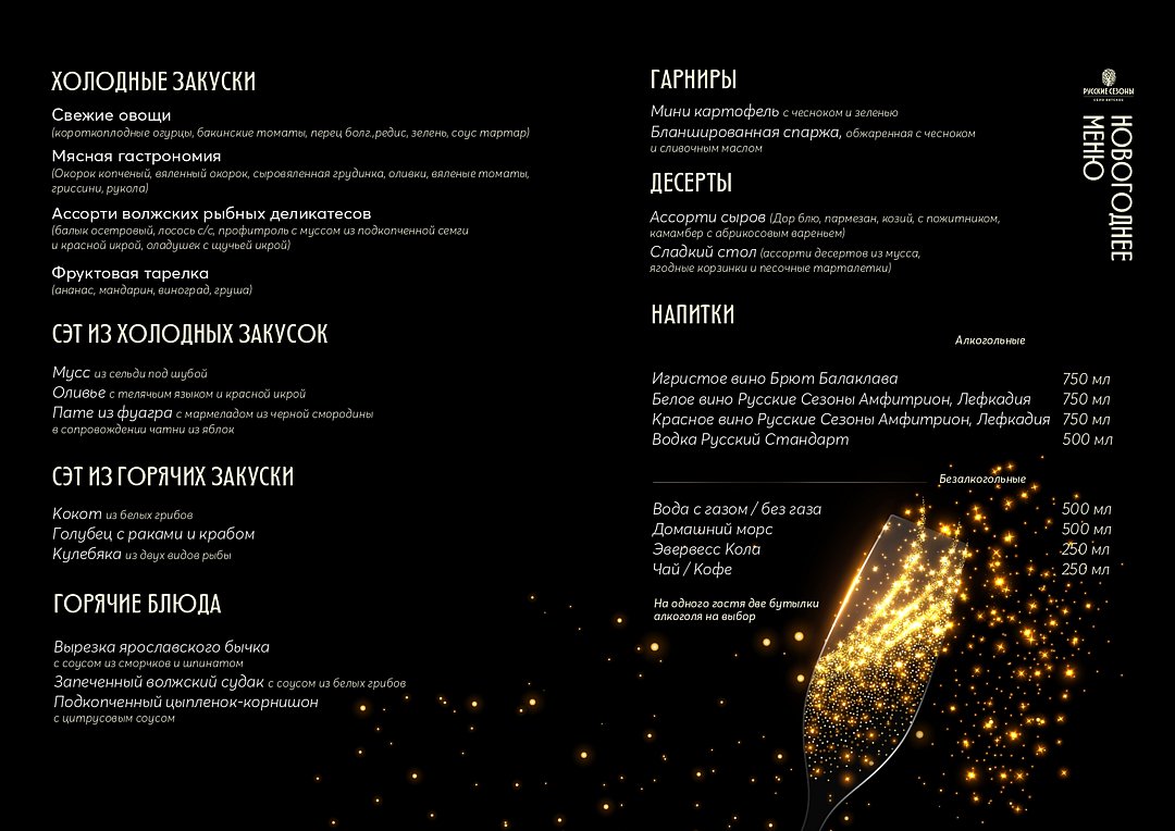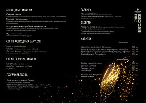 Великолепное меню порадует даже самых изысканных гурманов. Гости смогут насладиться изысканными блюдами, подобранными с любовью и вниманием к деталям.