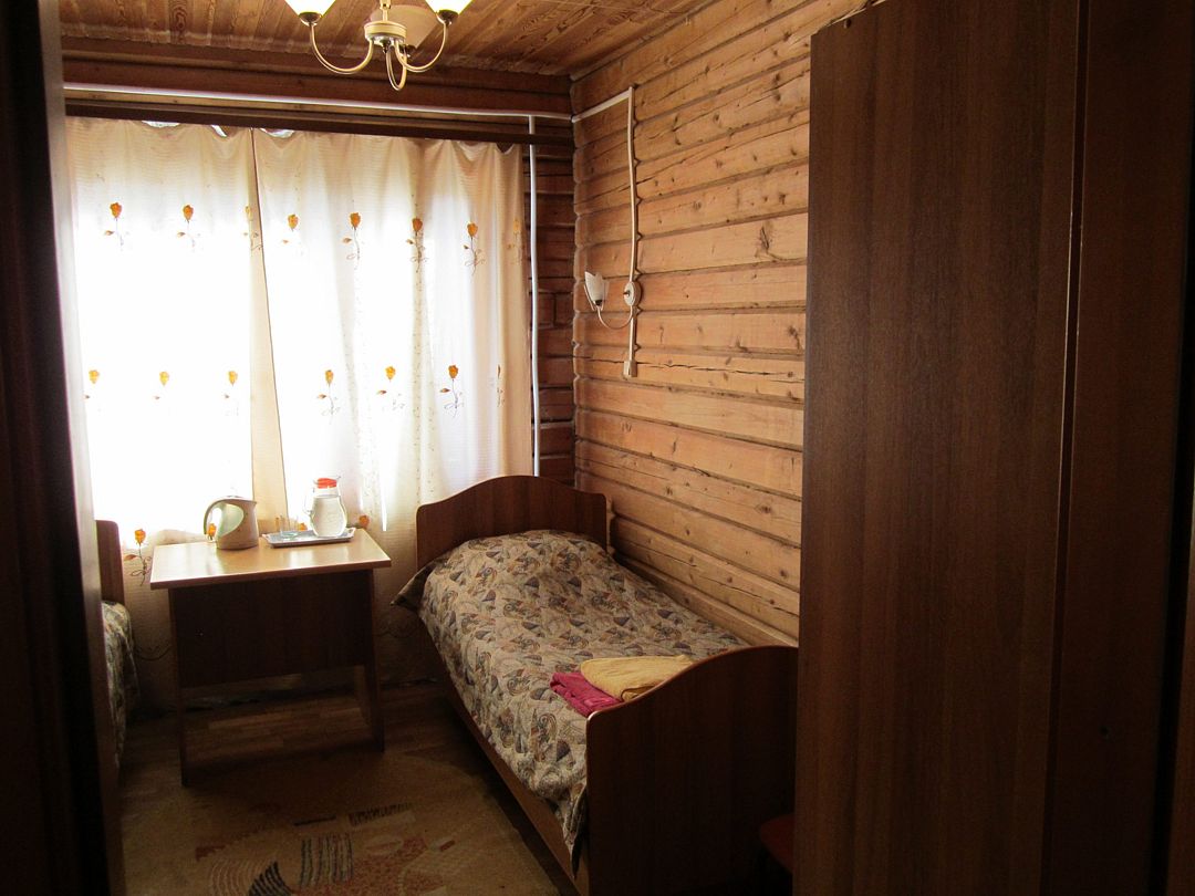 В номере есть 2 односпальные кровати, чайник, комод, стулья, сан.узел на этаже (душ, раковина, туалет).