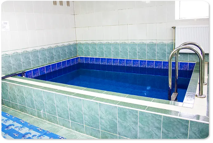 Финской сауной ("сухой" пар). Прохладный бассейн (для окунания) площадью 3,6 кв.м. (с фильтром для очистки воды), душевая.
